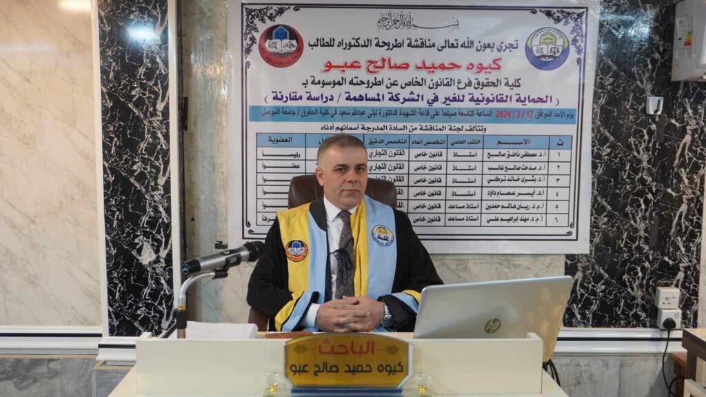 نظرا للجهود المتميزة المبذولة من قبل الدكتور ريان هاشم حمدون / كلية القانون والسياسة بجامعة كركوك في دعم الانشطة العلمية والثقافية والطلابية في كليتنا ومشاركته في مناقشة طالبة الدكتوراه في فرع القانون الخاص گيوة حميد صالح فقد تم تكريمه بشهادة تقديرية من قبل الاستاذ المساعد الدكتور وسام نعمت ابراهيم السعدي عميد الكلية وبدورها تهنئ عمادة الكلية والسادة اعضاء مجلس الكلية وكادريها العلمي والاداري وطلبتها الدكتور ريان هاشم حمدون متمنين له المزيد من العطاء العملي والابداع الاكاديمي خدمة لمسيرة العلم والمعرفة في كليتنا العزيزة جامعتنا العريقة وعراقنا الآبي .