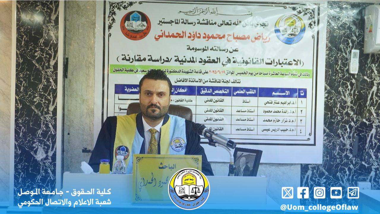 ناقش فرع القانون الخاص في كلية الحقوق بجامعة الموصل يوم الخميس الموافق ١٨ حزيران ٢٠٢٥ رسالة ماجستير عن الاعتبارات القانونية في العقود المدنية / دراسة مقارنة ، حضر جانبا منها الاستاذ الدكتور عبدالعزيز رمضان علي عميد الكلية وعددا من اعضاء مجلس الكلية وتدريسييها .