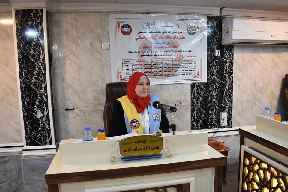 ترأس لجنة المناقشة الدكتور اسامة احمد محمد وعضوية الدكتورة اسراء يونس هادي والدكتورة ميادة محمد احمد وعضوية واشراف الدكتور طلال عبد حسين .
