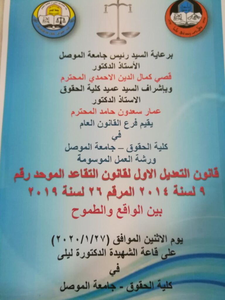 اجتمعت اللجنة العلمية لفرع القانون العام يوم الاثنين الموافق 20/1/2020 بحضور كافة اعضائها وجرت مناقشة مشروع تسجيل رسالة طالب الماجستير (ياسر خلف مهدي) الموسومة (الاحكام الموضوعية للجرائم الارهابية ) باشراف الدكتور (انس محمود خلف) , علما ان دراسة الطالب في فرع القانون العام/القانون الجنائي .