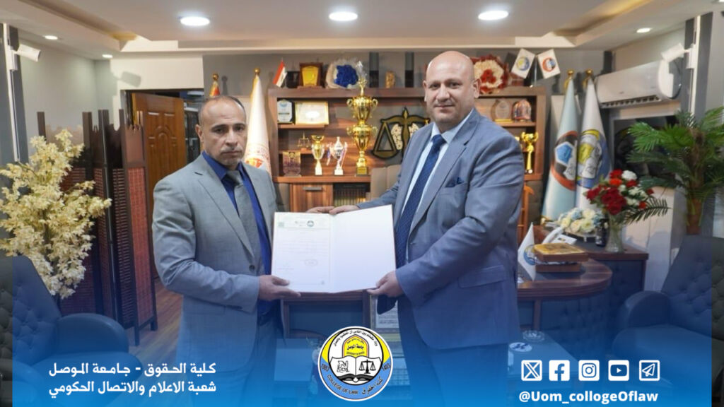 ناقش فرع القانون العام في كلية الحقوق بجامعة الموصل يوم الثلاثاء الموافق ٢٢ تموز ٢٠٢٥ اطروحة دكتوراه عن التعايش السلمي في إطار المواثيق الدولية والتشريعات الوطنية ، حضر جانبا منها الاستاذ الدكتور عبدالعزيز رمضان علي عميد الكلية وعددا من اعضاء مجلس الكلية وتدريسييها .