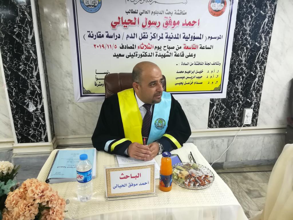 جرت في كليتنا يوم الثلاثاء الموافق 5/11/2019 مناقشة طالب الدبلوم العالي في فرع القانون الخاص (احمد موفق رسول) عن بحثه الموسوم (المسؤولية المدنية لمراكز نقل الدم /دراسة مقارنة) باشراف الدكتور صدام خزعل يحيى , حيث تعد عمليات نقل الدم من اهم الركائز الطبية المعاصرة وذلك من خلال العديد من الامراض وانقاذ حياة العديد من الاشخاص الا انها لا تخلو من المخاطر التي تنتج عنها في حالة عدم الالتزام بتطبيق القواعد العلمية الرصينة والمعتمدة فالخطأ في عملية نقل الدم قد يلحق ضررا لكل من المتبرع والمتبرع له وقد يؤدي الى الوفاة وتتمثل هذه المخاطر بنقل الدم الملوث او في اختلاف فصيلة الدم الامر الذي يؤدي الى قيام المسؤولية القانونية على المتسبب من هنا فقد نضمت الكثير من القوانين الوضعية عملية نقل الدم بالشكل الذي يؤدي الى المحافظة على حياة جميع الاطراف .