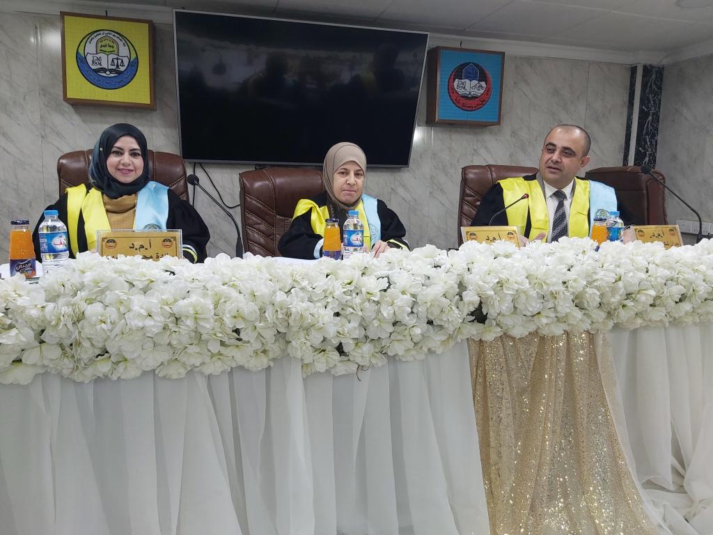 جرت صباح هذا اليوم الثلاثاء الموافق 5/12/2019 في/ فرع القانون العام مناقشة بحث الطالبة (رنا خيري مصطفى الصراف) الموسوم ب(اثر الصفة في الإجراءات الجزائية) بإشراف الدكتورة (رائدة محمد محمود ) استاذة القانون المدني وتألفت لجنة المناقشة من الاساتذة المدرجة اسمائهم ادناه :