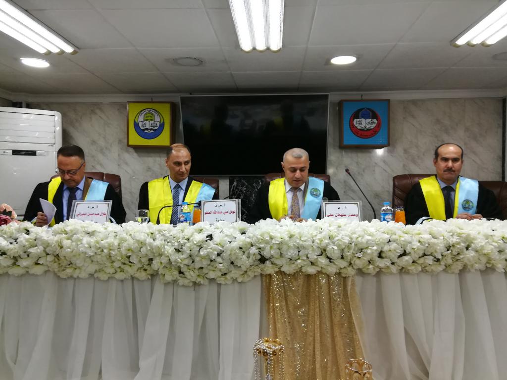 جرت يوم الاثنين الموافق 2/12/2019 مناقشة رسالة الماجستير / فرع القانون العام للطالبة (سارة محمد صالح) و الموسومة (اثر الصفة في الاجراءات الجزائية) بإشراف الدكتور (طلال عبد حسين ) استاذ القانون الجنائي المساعد وتألفت لجنة المناقشة من الاساتذة المدرجة اسمائهم ادناه :