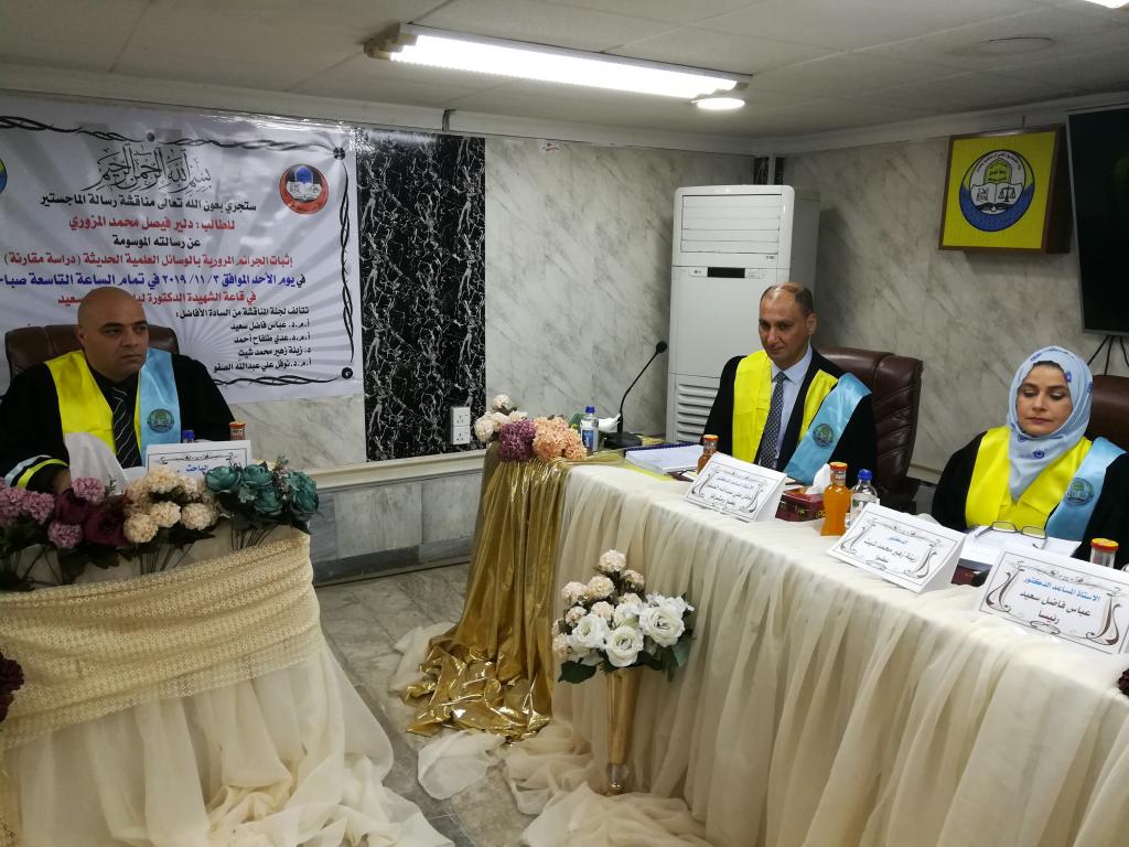 جرت في كليتنا يوم الاحد الموافق 3/11/2019 مناقشة طالب الماجستير (دلير فيصل محمد) عن رسالته الموسومة (اثبات الجرائم المرورية بالوسائل العلمية الحديثة /دراسة مقارنة) وقد اشرف على كتابة الرسالة الدكتور نوفل علي عبدالله استاذ القانون الجنائي المساعد وتهدف الرسالة الى ضرورة التعريف بالجريمة المرورية في قانون ادارة المرور العراقي ومعاقبة قائدي المركبات في حالة عدم استخدامهم للنظارة الطبية المقرر استعمالها عند القيادة اضافة الى ضرورة تجريم السائق في حالة وضعه اجهزة تكشف مواقع قياس سرعة المركبات .