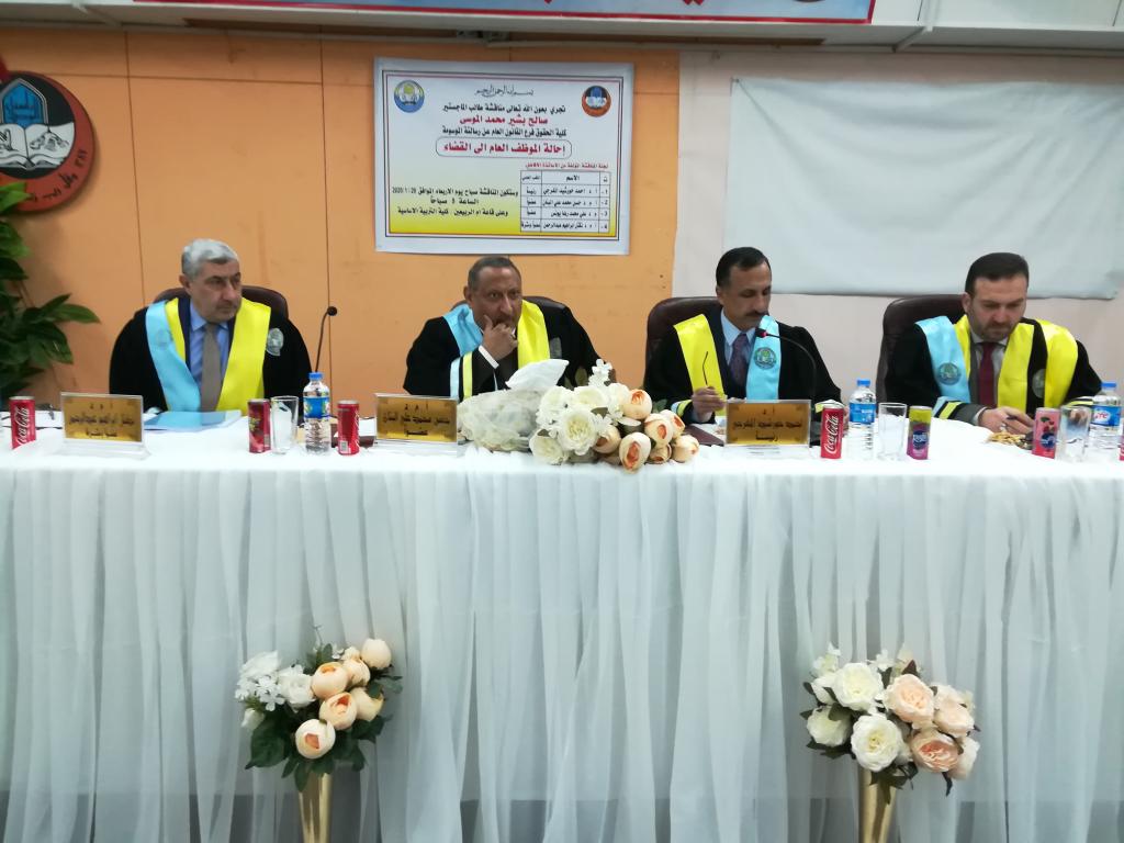 جرت في كليتنا يوم الاربعاء الموافق 29/1/2020 مناقشة طالب الماجستير (صالح بشير محمد) عن رسالته الموسومة (احالة الموظف العام الى القضاء) باشراف الدكتور (نكتل ابراهيم عبدالرحمن) وقد توصل الباحث الى عدد من النتائج كان في مقدمتها ان احالة الموظف العام الى القضاء يجب ان يكون بموجب قرار اداري صادر من سلطة ادارية هذا يؤدي الى انطباق المفهوم الجنائي الواسع للموظف وهذا القرار من شأنه ان يضيف صفة المتهم على الموظف العام وفي ختام المناقشة قبلت اللجنة رسالة الطالب وتم منحه شهادة الماجستير في القانون العام/القانون الاداري