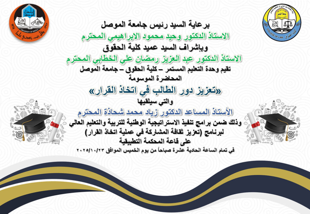 الندوة العلمية الموسومة ” الصحة النفسية في حالات الطوارئ الانسانية ” وبالتعاون مع دائرة صحة نينوى وذلك يوم الخميس الموافق 23/10/2025 الساعة العاشرة صباحاً في قاعة مبنى الرئاسة الجديد وذلك لاهمية هذا الجانب الارشادي والتعليمي في الجامعات والكليات