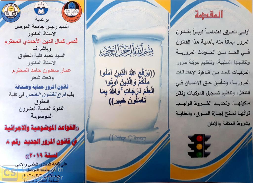برعاية الاستاذ الدكتور ( قصي كمال الدين الاحمدي) المحترم رئيس جامعة الموصل وباشراف الدكتور (عمار سعدون حامد ) المحترم عميد الكلية ، تحت شعار (قانون المرور حماية وضمانة) يقيم فرع القانون الخاص في كلية الحقوق ندوته العلمية العشرون بعنوان ( القواعد الموضوعية والاجرائية في قانون المرور الجديد) على قاعة المنتدى العلمي والادبي يوم الاثنين الموافق 2/3/2020 في تمام الساعة العاشرة صباحا .