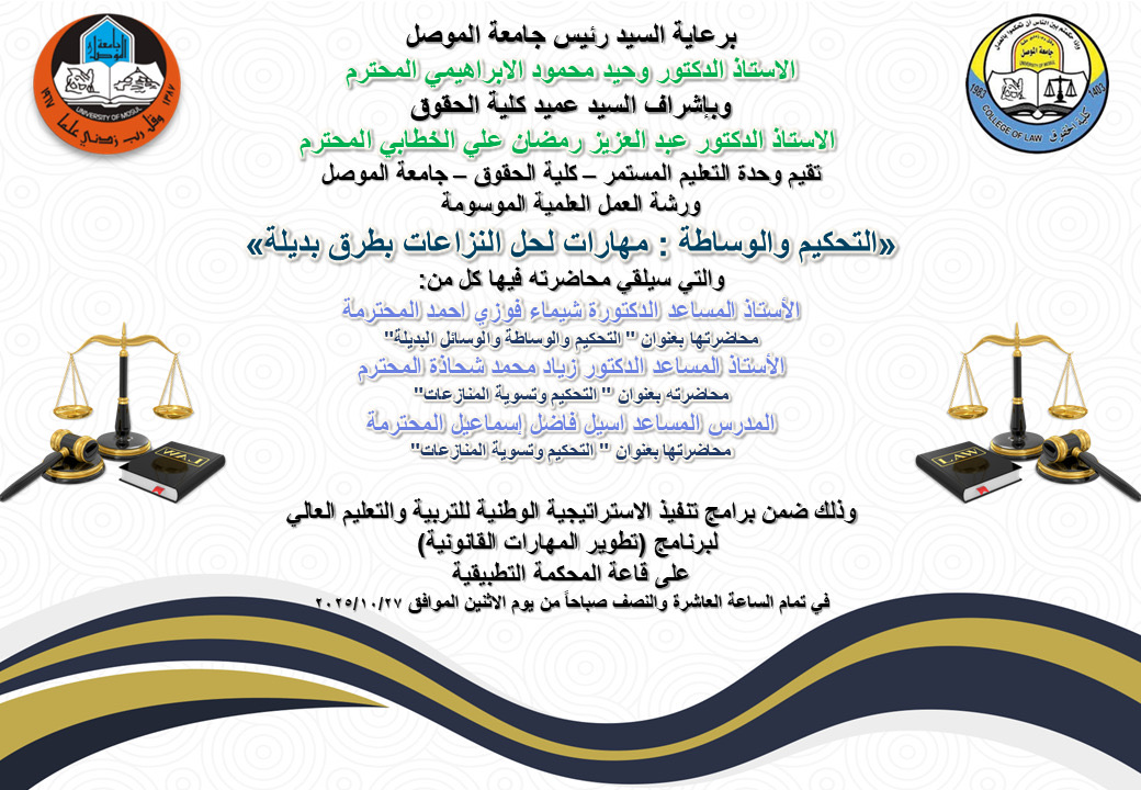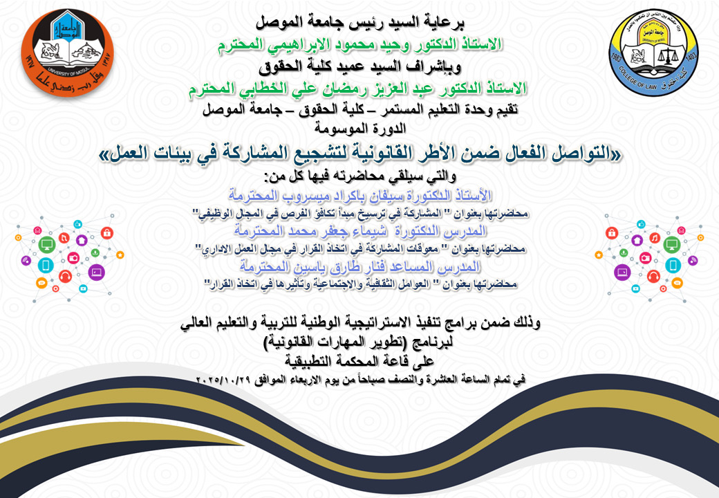 كلية الحقوق في جامعة الموصل تنظّم ورشة عمل حول “التواصل الفعّال ضمن الأطر القانونية لتشجيع المشاركة في بيئات العمل” أقامت وحدة التعليم المستمر في كلية [إقرأ المزيد]