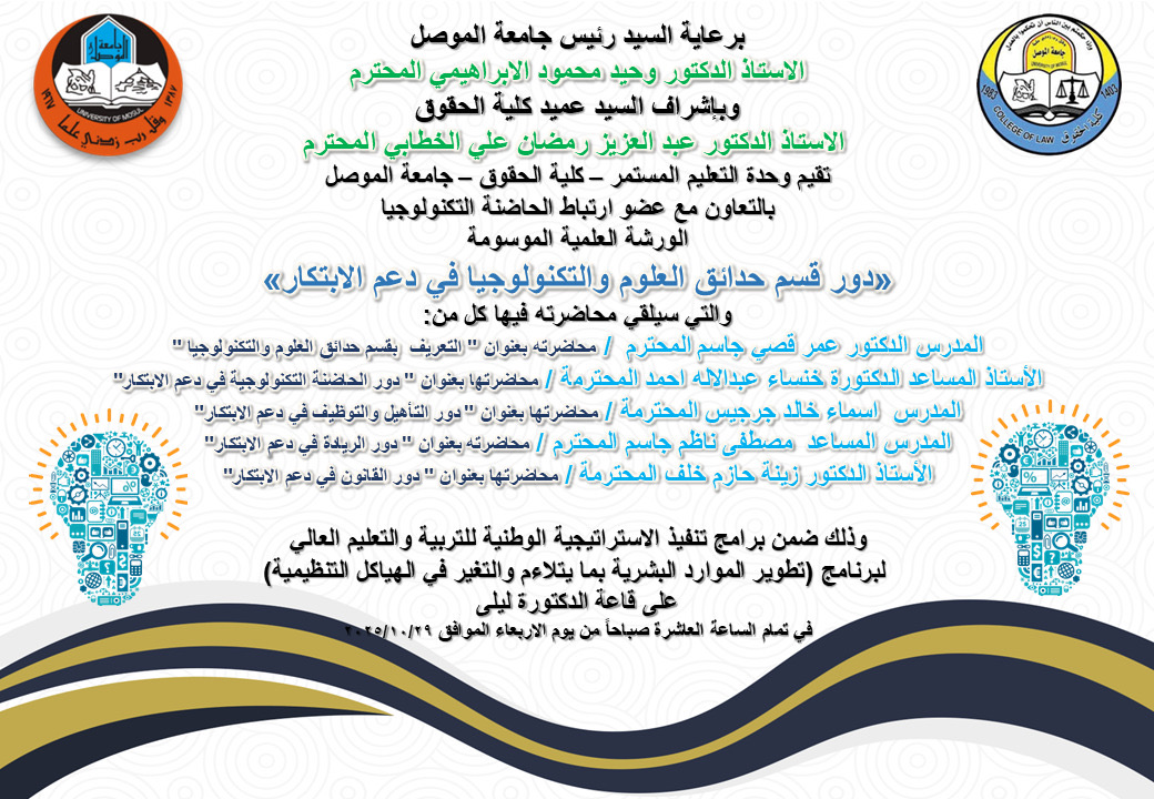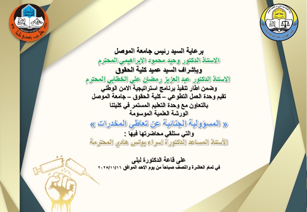 برعاية الاستاذ الدكتور وحيد محمود الإبراهيمي المحترم / رئيس جامعة الموصل و بأشراف السيد عميد كلية الحقوق الاستاذ الدكتور عبدالعزيز رمضان علي الخطابي وبالتعاون مع [إقرأ المزيد]