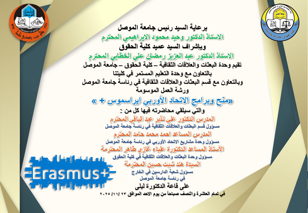 نظّمت وحدة البعثات والعلاقات الثقافية في كلية الحقوق – جامعة الموصل، وبالتعاون مع وحدة التعليم المستمر وقسم البعثات والعلاقات الثقافية في رئاسة الجامعة، ورشة عمل [إقرأ المزيد]