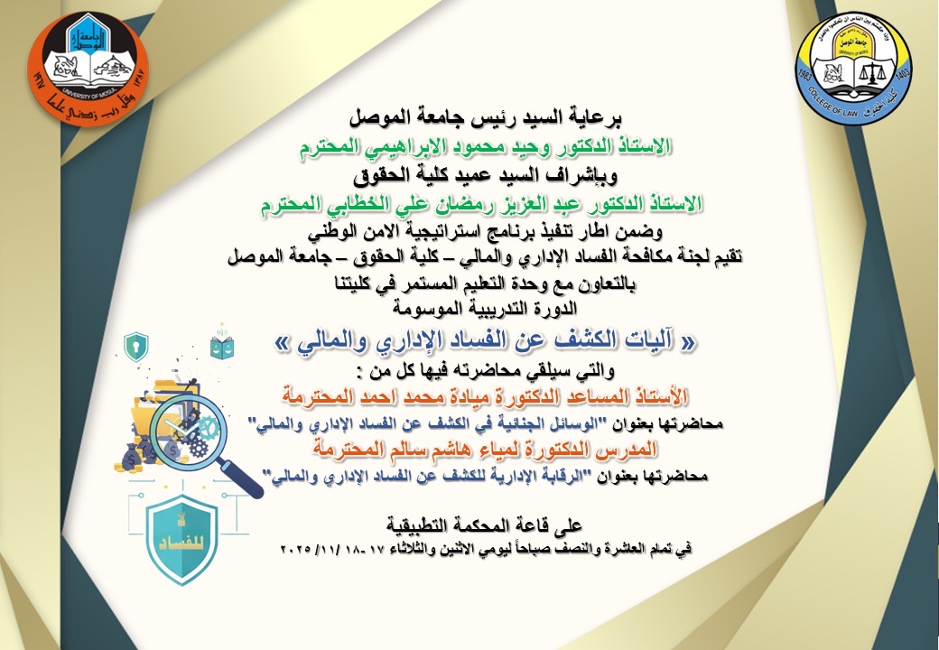 مشاركة تدريسيان من كلية الحقوق جامعة الموصل في دورة تدريبية في فلسفة مكافحة الفساد الإداري والمالي شارك كلٌّ من الأستاذ المساعد الدكتور أبو بكر أحمد [إقرأ المزيد]