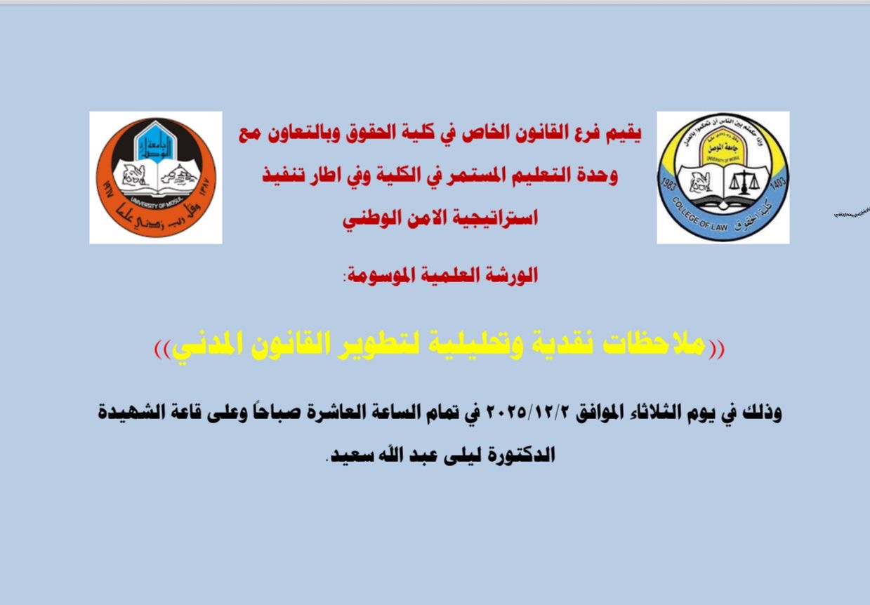 زيارة ميدانية لطلبة كلية الحقوق إلى محكمة استئناف نينوى الاتحادية جرى صباح يوم الثلاثاء الموافق ٢٥ تشرين الثاني 2025 زيارة ميدانية لطلبة المرحلة الثانية – [إقرأ المزيد]