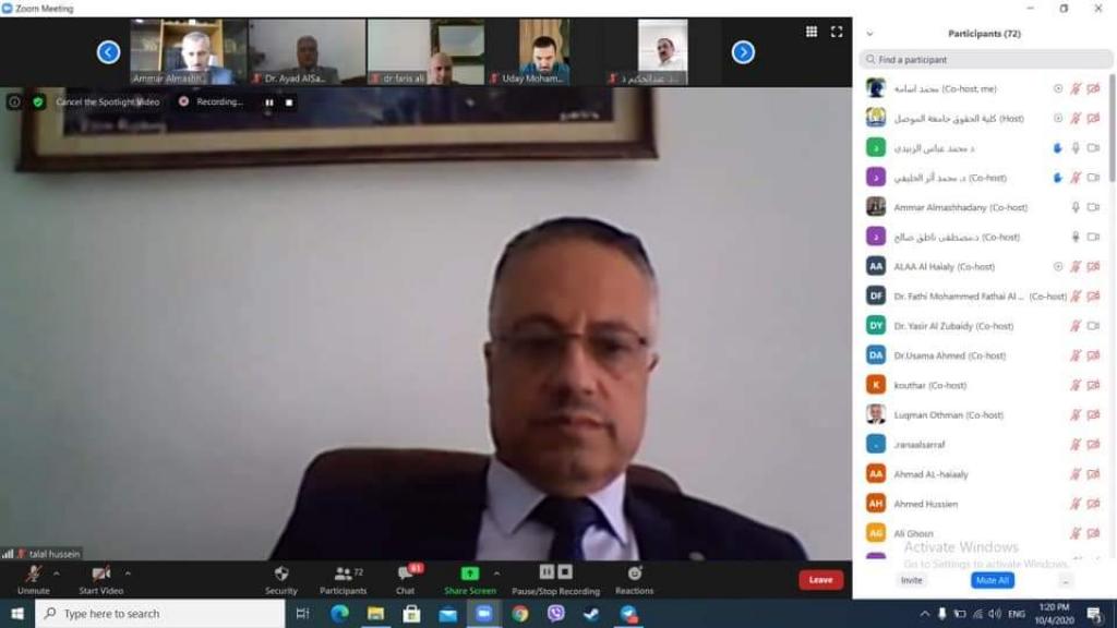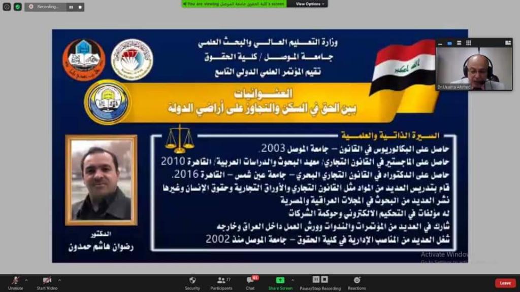 جرت اليوم وقائع جلسات المؤتمر الدولي التاسع والافتراضي الذي عقدته كلية الحقوق من خلال تطبيق zoom تحت عنوان العشوائيات بين الحق في السكن والتجاوز على اراضي الدولة برعاية وزارة التعليم العالي والبحث العلمي ،محافظة نينوى ،الوكالة الجامعية الفرنكفونية،مجلة الرافدين للحقوق ،وقد تضمن حفل الافتتاح عزف النشيد الوطني وتلاوة ايات من القران الكريم ، وتلا ذلك كلمة السيد عميد كلية الحقوق الاستاذ المساعد الدكتور وسام نعمت السعدي الذي رحب بالحضور الكريم من الضيوف والباحثين من الدول العربية ومختلف الجامعات العراقية ، وعرض اسباب اختيار موضوع المؤتمر واهميته الحيوية كونه احدى الهموم التي يعاني منها المجتمع العراقي ودور الباحثين في القانون في وضع الحلول التي تسهم في التخفيف من اثار هذه المشكلة،وقد ابدى الاستاذ الدكتور منير سالم طه المساعد العلمي لرئيس جامعة الموصل في كلمته دعم رئاسة الجامعة للانشطة العلمية التي تسهم في تقديم الحلول وتحسين الحياة في البيئة والمجتمع الحاضن للجامعة، وقدم السيد محافظ نينوى رؤية المحافظة لاسباب هذه المشكلة واليات حلها انيا وعلى المدى القريب ،وتلى ذلك كلمة المدير الاقليمي للوكالة الجامعية الفرنكفونية احد رعاة المؤتمر في اطار التعاون مع جامعة الموصل من خلال رعاية اعمال المؤتمر ودعمه ، وقدمت الاستاذ الدكتور قبس حسن عواد كلمة اللجنة التحضيرية من خلال عرض مراحل التخطيط لعقد المؤتمر والجهود الكبرى التي بذلتها لجان المؤتمر في سبيل اظهاره بصورة مشرفة للكلية والحامعة ،واختتم الحفل بفيلم وثائقي يعبر عن اسباب مشكلة العشوائيات والاثار التي نجمت عنها والاليات القانونية لحلها وخاصة في مدينة الموصل .وقد تم عقد جلستين بحثيتين اشترك فيها اساتذة من جامعات عربية من لبنان وتونس والبحرين،فضلا عن جامعات بابل وكركوك وجامعةصلاح الدين والنور الجامعة ومحافظة ميسان وجامعة الموصل من خلال الباحثين في كليتي الحقوق والادارة والاقتصاد في موضوعات متنوعة ركزت على بحث جوانب العشوائيات القانونية والبيئية والمجتمعية ،مع مداخلات متنوعة من السادة الحضور من العراق والدول العربية.وغدا ان شاءالله سيتم عقد جلسات اليوم الثاني للمؤتمر بجلستين بخثية وحفل ختام يبرز اهم النتائج والتوصيات التي يمكن ان تسهم في تقديم حلول مهمة لتحسين حياة المواطن العراقي .