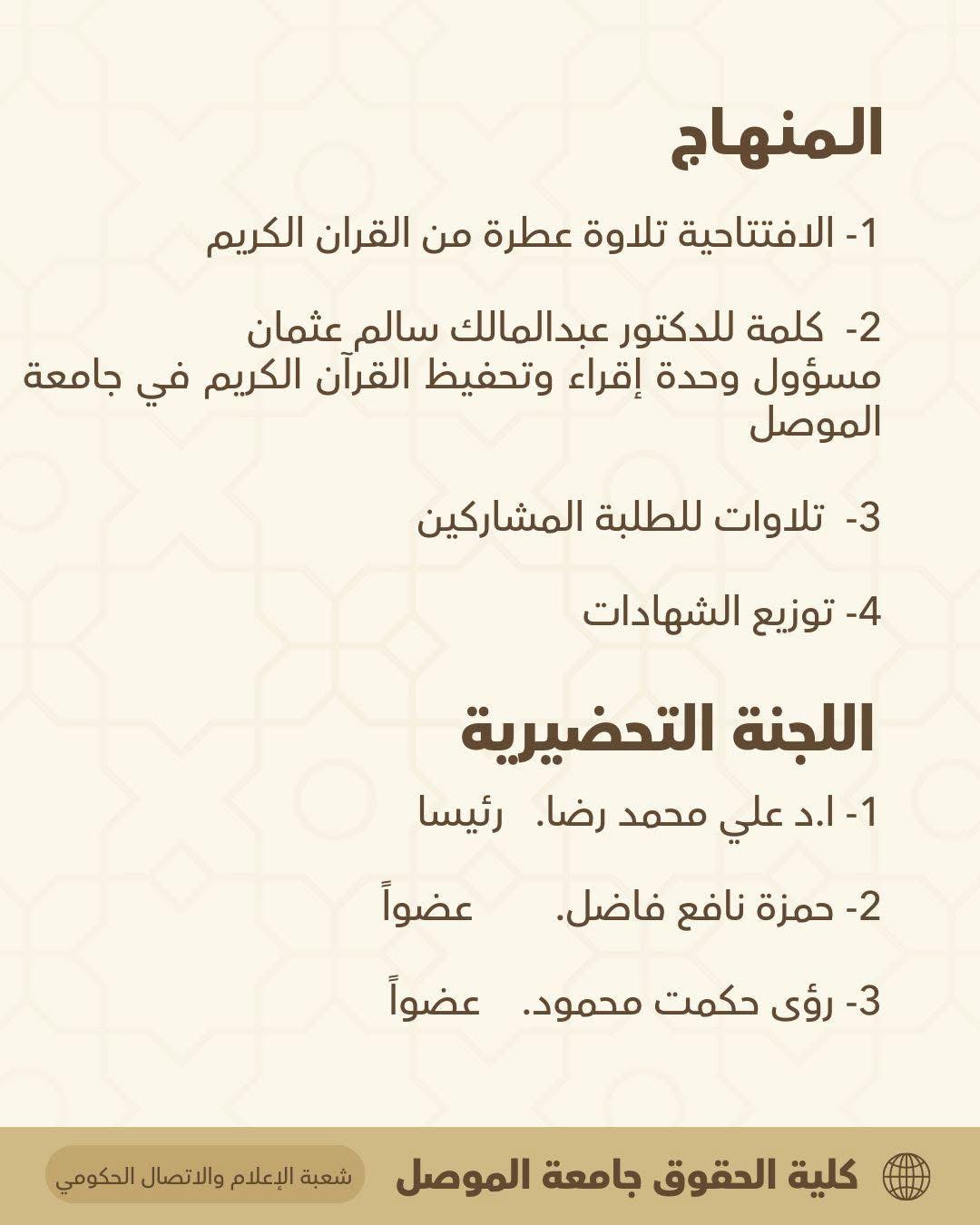 اعلان عن اقامة احتفاء باليوم الوطني للقران الكريم في كلية الحقوق. يوم الاربعاء الموافق 21 كانون الثاني 2026.