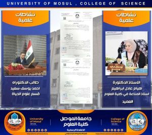 منح السيد رئيس جامعة الموصل الأستاذ الدكتور قصي كمال الدين الأحمدي المحترم كتاب شكر و تقدير الى السيدة عميد كلية العلوم الاستاذ الدكتورة هيام عادل إبراهيم وطالب الدكتوراه أحمد يوسف سعيد ، بالنظر لجهودهم في تسجيل أربع عزلات بكتيرية جديدة في بنك الجينات العالمي NCBI..