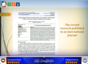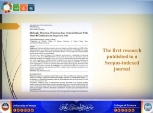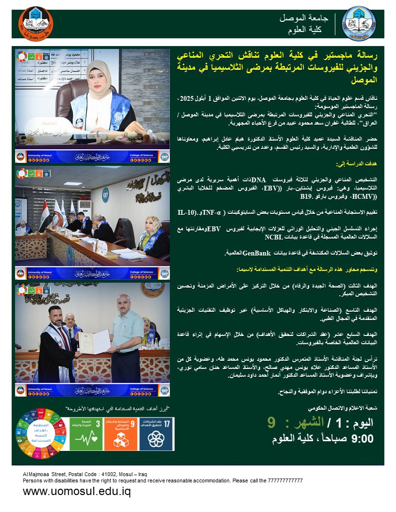 ناقش قسم علوم الحياة في كلية العلوم بجامعة الموصل، يوم الاثنين الموافق 1 أيلول 2025، رسالة الماجستير الموسومة ” التحري المناعي والجزيئي للفيروسات المرتبطة بمرضى الثلاسيميا في مدينة الموصل / العراق”، للطالبة غفران سعد محمود عبيد من فرع الأحياء المجهرية.