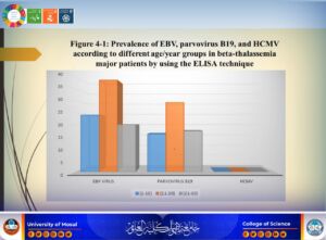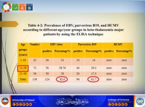 - التشخيص المناعي والجزيئي لثلاثة فيروسات DNA ذات أهمية سريرية لدى مرضى الثلاسيميا، وهي: فيروس إبشتاين–بار (EBV)، الفيروس المضخم للخلايا البشري (HCMV)، وفيروس بارفو