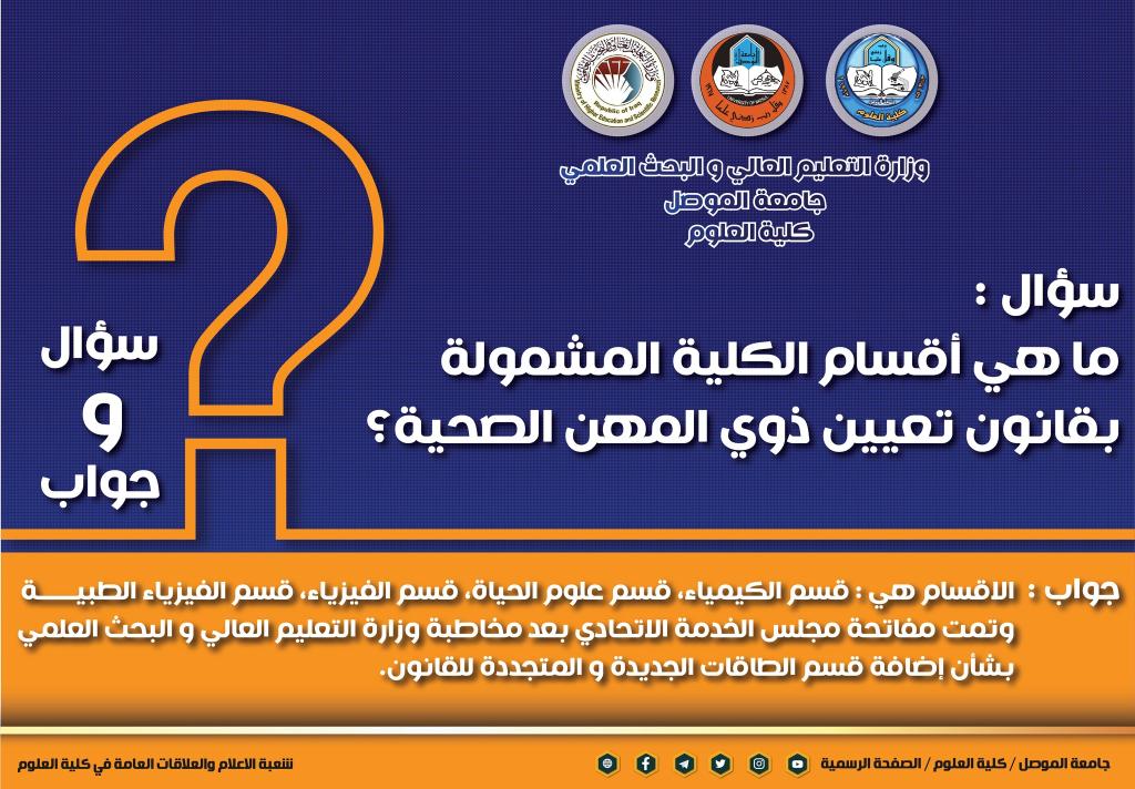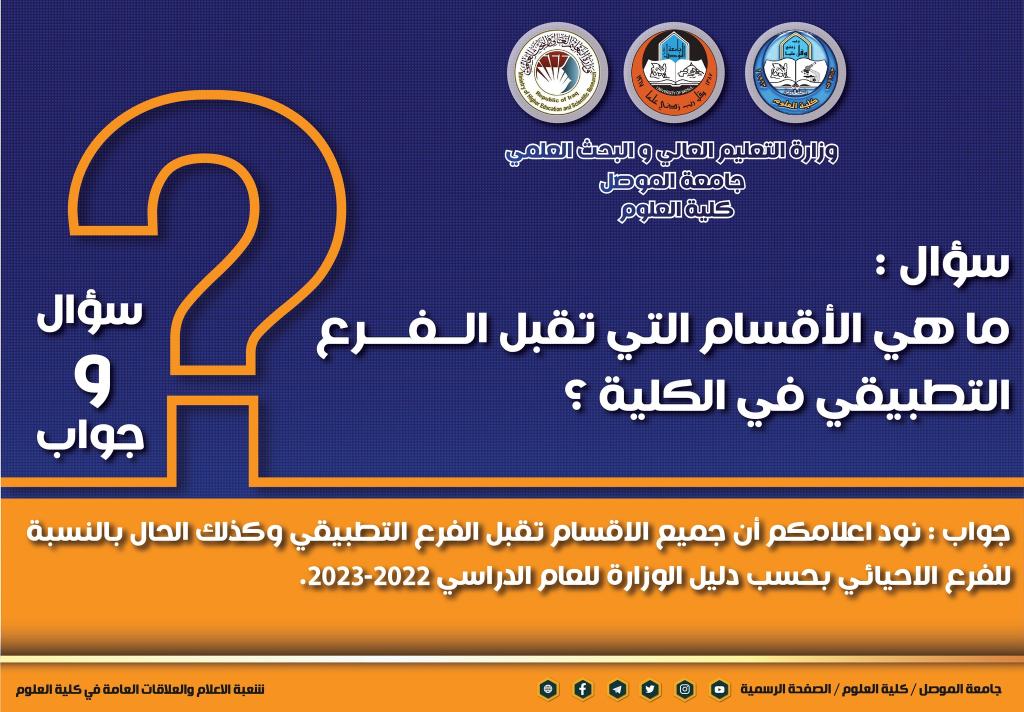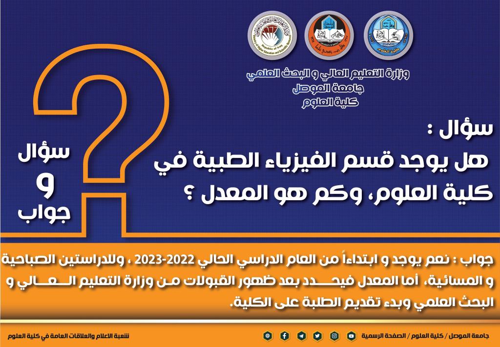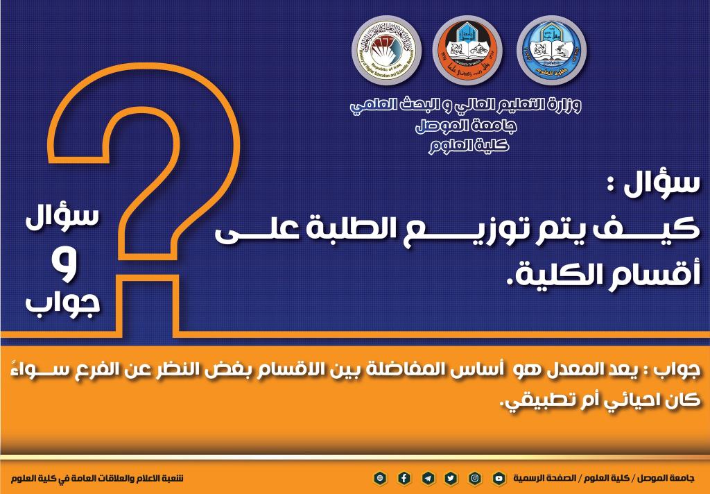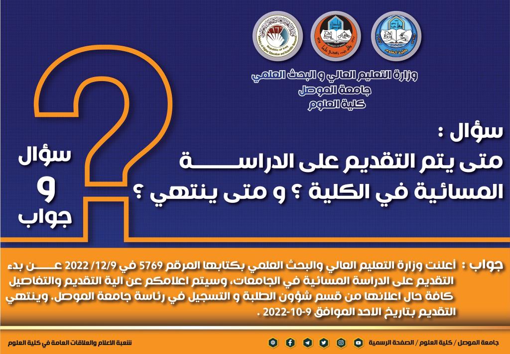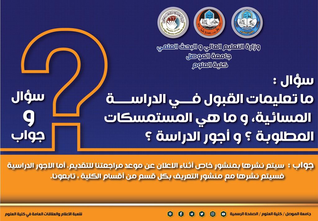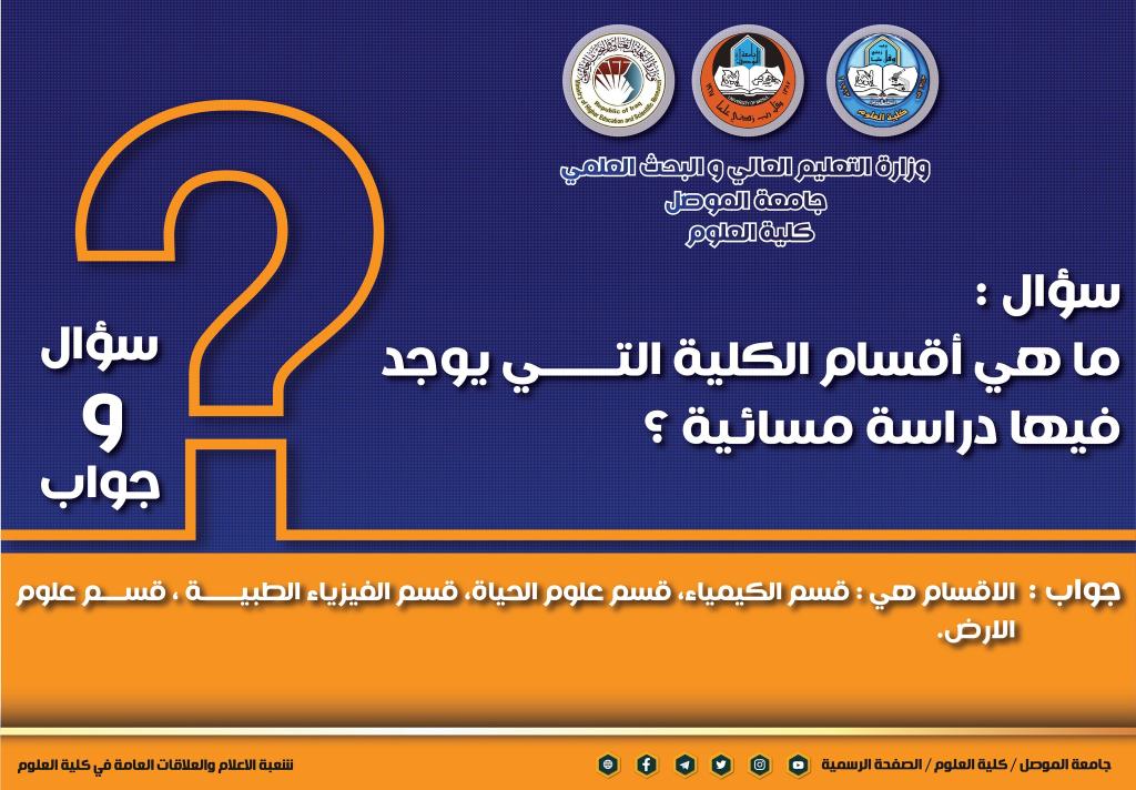 فقرة جديدة تطلقها كلية العلوم استناداً الى توجيهات السيدة عميد الكلية الأستاذ الدكتورة هيام عادل إبراهيم للإجابة عن أبرز تساؤلات الطلبة و الخريجين و المنتسبين .و مع تقديم الطلبة على استمارة منظومة القبول المركزي و كثرة التساؤلات التي تردنا عن الكلية و أقسامها و الدراسة المسائية فيها ، نجيب في فقرتنا لهذا اليوم عن أكثر الأسئلة التي وردتنا في الآونة الأخيرة .جدير بالذكر أن الكلية ستنشر كذلك مساء هذا اليوم نبذة تعريفية عن كل قسم من أقسامها مع معلومات القبول.شعبة الإعلام والعلاقات العامةالثلاثاء 13 أيلول 2022