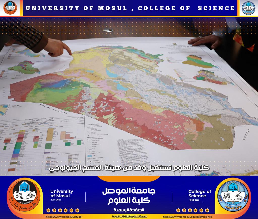 تجسيداً لأطر التعاون و الانفتاح مع مؤسسات و دوائر الدولة و تأكيداً على نهج الجامعة و الكلية في ذلك ، استقبلت السيدة عميد كلية العلوم الأستاذ الدكتورة هيام عادل إبراهيم وفداً من هيئة المسح الجيولوجي العراقية ضم كل من السيد أرقم وعد الله قاسم و السيد عمر الياس خضر بحضور السيد رئيس قسم علوم الأرض الأستاذ الدكتور عمر أحمد مولود البدراني صباح يوم الإثنين الموافق 23 كانون الثاني 2023.جرى خلال اللقاء التباحث حول آلية التعاون البنّاء بين الكلية و الهيئة من خلال اقامة ورش و دورات تدريبية لمنتسبي و طلبة قسم علوم الأرض في كليتنا ودعم متحف القسم، بدوره أهدى الوفد الزائر كليتنا خريطتين للعراق احداها جيولوجية توضح انتشار التكاوين الجيولوجية و الأخرى تركيبية توضح مواقع الكسور و الطيات في أنحاء العراق ، إضافة الى عدة صخور و نماذج حجرية ورملية جمعت من مناطق مختلفة من العراق.بدورها عبرت السيدة العميد عن شكرها و تقديرها للوفد الزائر لرفدهم الكلية بهذه الخرائط الدقيقة و النماذج القيمة ، شاكرة جهدهم الكبير في تجميع مثل هذه النماذج الذي يتطلب و قتاً وعملاً كبيرين ، داعية المولى عز وجل لهم كل التوفيق و السداد خدمة لبلدنا العزيز.شعبة الإعلام والعلاقات العامةالاثنين 23 كانون الثاني 2023