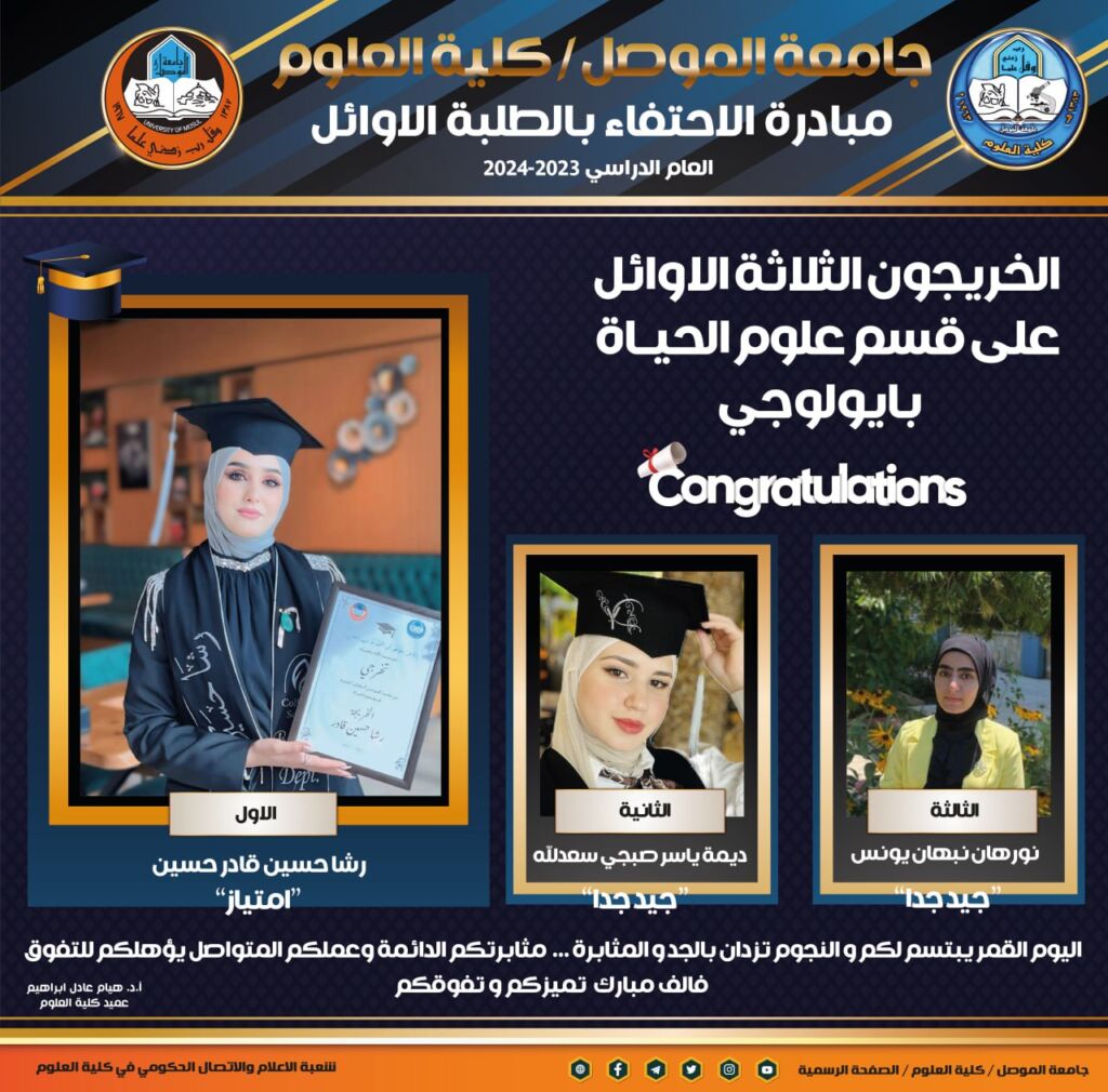وبهذه المناسبة تتقدم أسرة كلية العلوم متمثلةً بالسيدة العميد الأستاذ الدكتورة (هيام عادل إبراهيم الطائي) المحترمة، بأجمل عبارات التهاني والتبريكات لطلبتنا المتفوقين والناجحين، متمنيةً لهم دوام النجاح والتفوق والعطاء.