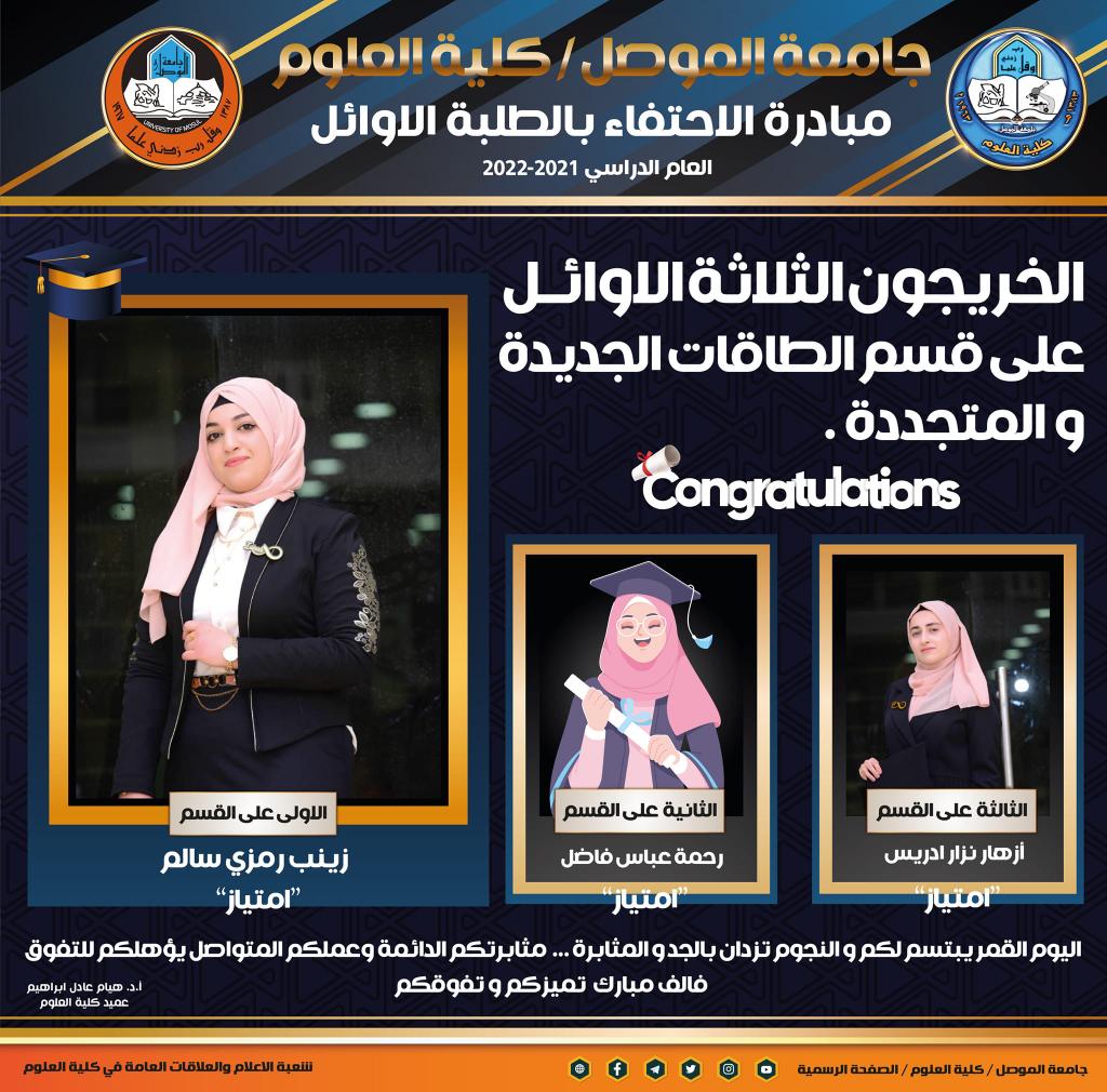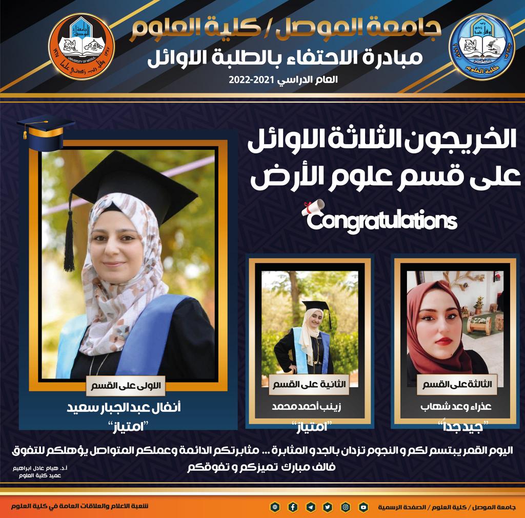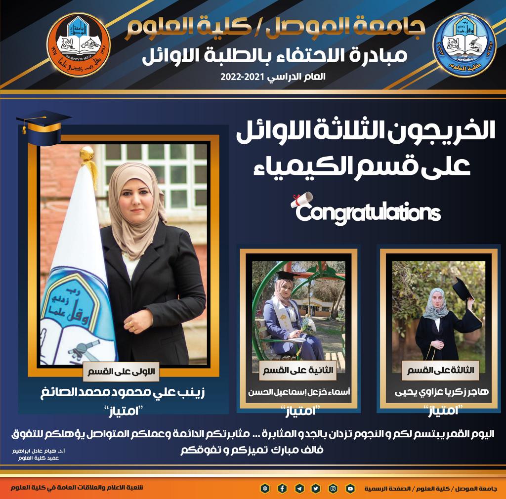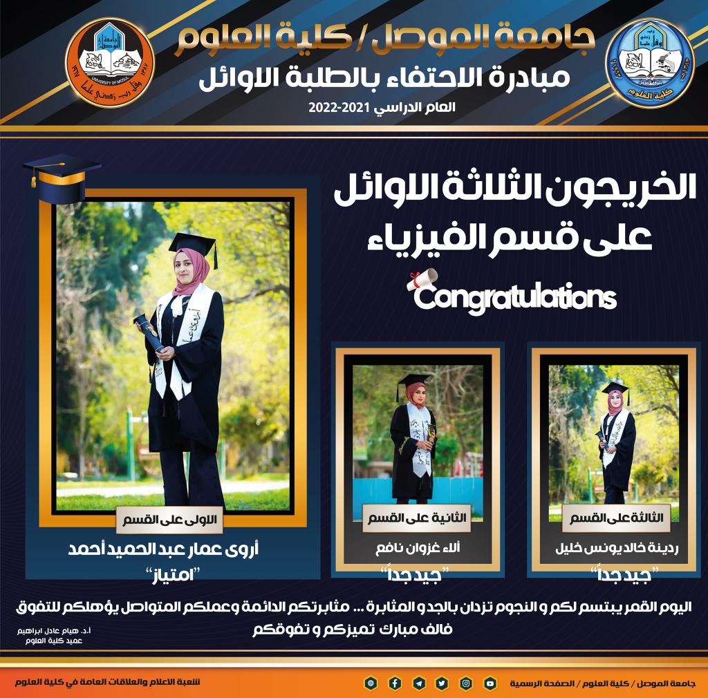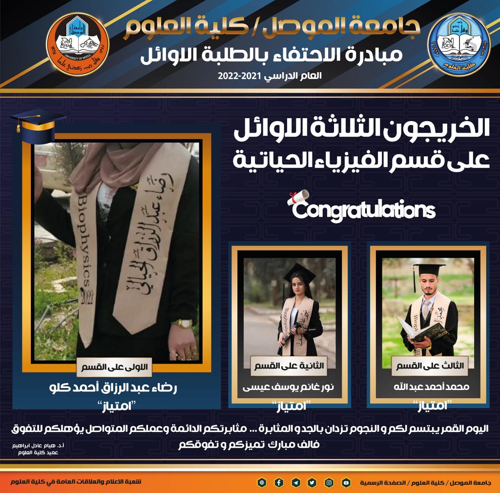 استناداً الى توجيهات السيدة عميد الكلية الأستاذ الدكتورة هيام عادل إبراهيم المحترمة ، وضمن مبادرة ( الاحتفاء بالطلبة الأوائل للعام الدراسي 2021-2022 ) ، تعلن كلية العلوم عن الثلاثة الخريجون الأوائل على أقسام الكلية للعام الدراسي 2021-2022، وبهذه المناسبة العطرة و السعيدة تتقدم أسرة كلية العلوم ممثلة بالسيدة العميد بأسمى التهاني و أرق و أغلى الأماني لطلبتنا المتفوقون و لذويهم الأكارم ، راجين من المولى عز وجل أن يمن عليهم بمستقبل مشرق و يوفقهم في مسيرتهم المقبلة لما فيه خدمة العباد والبلاد.جديرٌ بالذكر أن الكلية ستقيم لطلبتنا الأوائل احتفاءً و تكريماً حضورياً مع عرضٍ فيديويٍ لمسيرتهم المتميزة و ذلك الشهر القادم إن شاء الله.” اليوم القمر يبتسم لكم و النجوم تزدان بالجد و المثابرة … مثابرتكم الدائمة وعملكم المتواصل يؤهلكم للتفوق ، فالف مبارك تميزكم و تفوقكم “أ. د. هيام عادل إبراهيمعميد كلية العلوم
