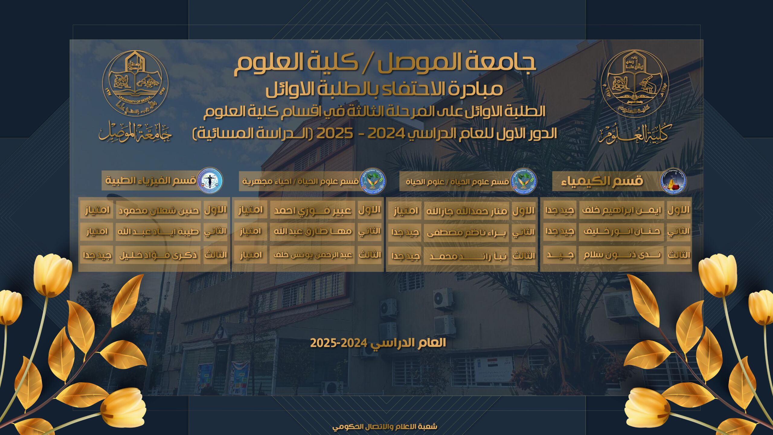 تُعلن كلية العلوم – جامعة الموصل، اليوم الأربعاء 23 تموز 2025، عن تسلسلات الطلبة الثلاثة الأوائل على المرحلة الثالثة / الدراسة المسائية للعام الدراسي 2024–2025.