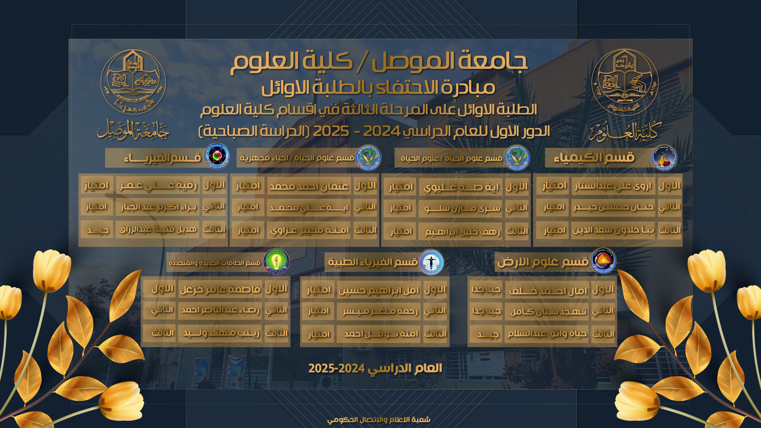 كلية العلوم تُعلن تسلسلات الطلبة الثلاثة الأوائل على المرحلة الثالثة في جميع أقسامها للعام الدراسي 2024–2025