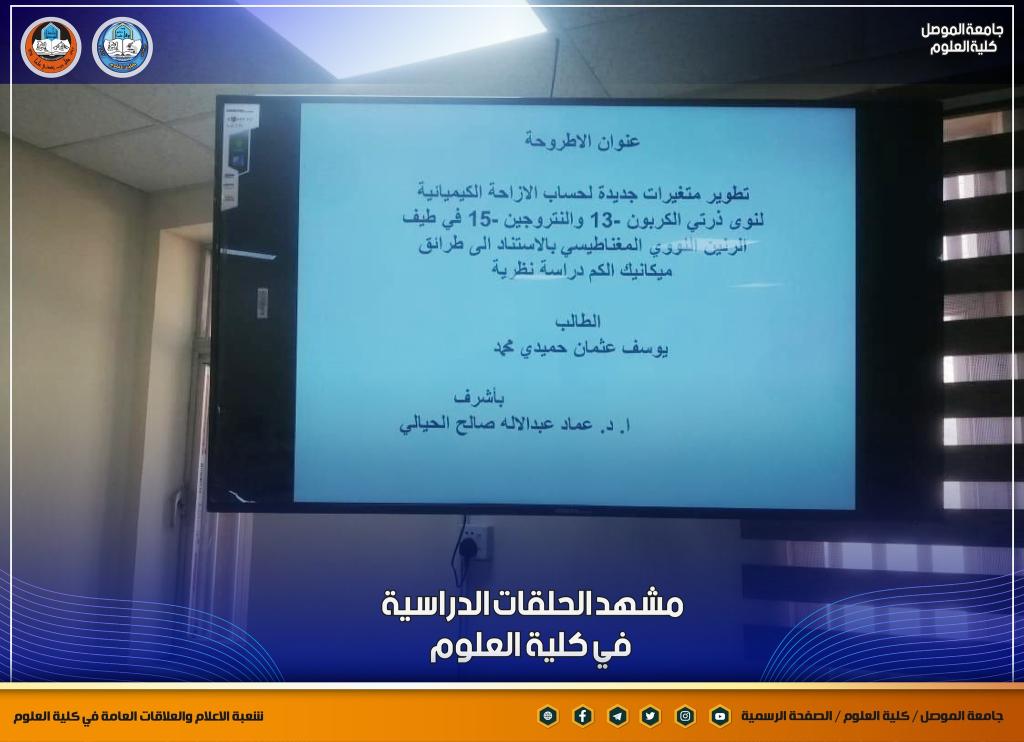 ضمن مشهد الحلقات الدراسية في كليتنا و في قسم الكيمياء القى طالب الدكتوراه يوسف عثمان حميدي محمد حلقة دراسية عن اطروحته الموسومة ( تطوير متغيرات جديدة لحساب الازاحة الكيميائية لنوى ذرتي الكاربهن-۱۳ والنايتروجين -۱٥ في طيف الرنين النووي المغناطيسي بالاستناد الى طرائق كيمياء الكم، دراسة نظرية) باختصاص الكيمياء الفيزياوية وبإشراف الأستاذ الدكتور عماد عبدالاله صالح الحيالي ، وذلك يوم الأثنين الموافق 10 تشرين الاول 2022 على قاعة المناقشات في قسم الكيمياء.تمنياتنا للطالب بالتوفيقشعبة الإعلام والعلاقات العامةالثلاثاء 11 تشرين الأول 2022