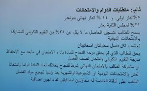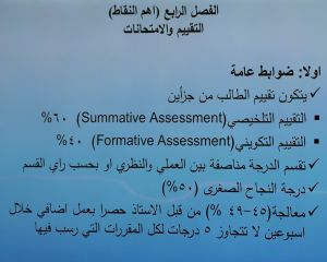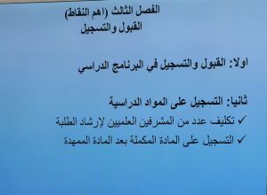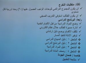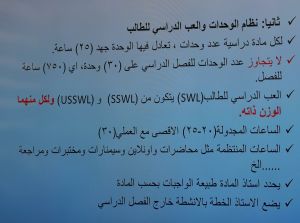 أما المحور الثاني فقد تناول تهيئة المناهج الدراسية لكل المراحل لتطبيق النظام و في ختام الورشة تم التطرق إلى آلية وضع الوحدات الدراسية والساعات من حيث تنوع نشاطات الطلبة من ناحية المحاضرات في القاعات الدراسية وخارجها مثل الواجبات البيتية وغيرها.