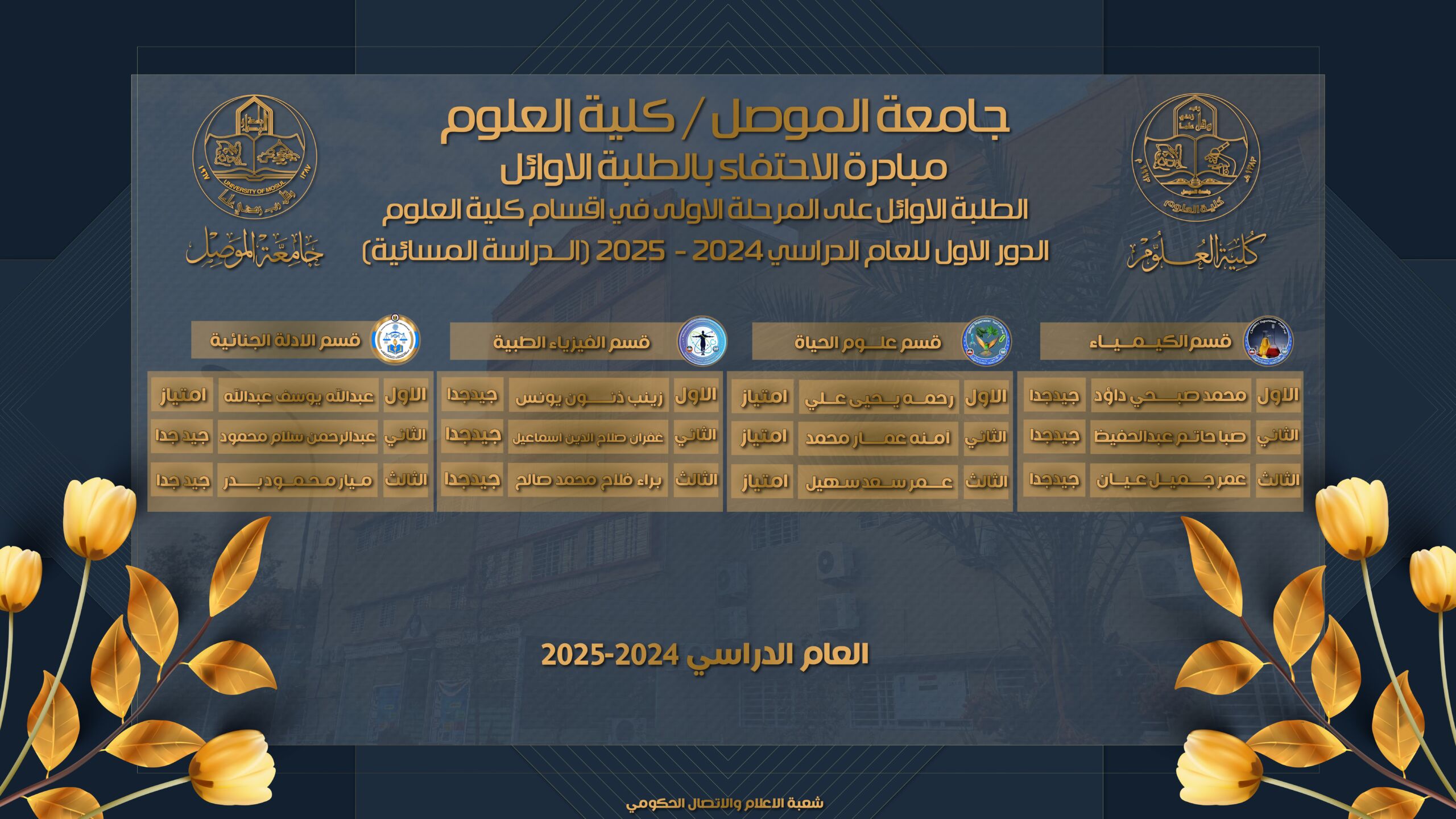 أعلنت كلية العلوم – جامعة الموصل، اليوم الجمعة الموافق 25 تموز 2025، عن تسلسلات الطلبة الثلاثة الأوائل على المرحلة الأولى / الدراسة المسائية للعام الدراسي 2024–2025، في مختلف الأقسام العلمية التابعة للكلية.