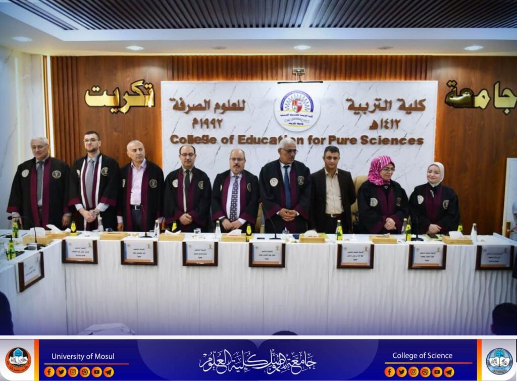 ترأس لجنة المناقشة السيدة عميد كلية العلوم الأستاذ الدكتورة (هيام عادل الطائي) وعضوية كل من الأستاذ الدكتورة (سوسن محمد عبدالله) والأستاذ المساعد الدكتور (ريان مازن فيصل) والأستاذ المساعد الدكتورة (رسمية عمر سلطان) والأستاذ المساعد الدكتورة (آلاء حسين طه) وبإشراف وعضوية الأستاذ الدكتورة (أميرة محمود محمد) .