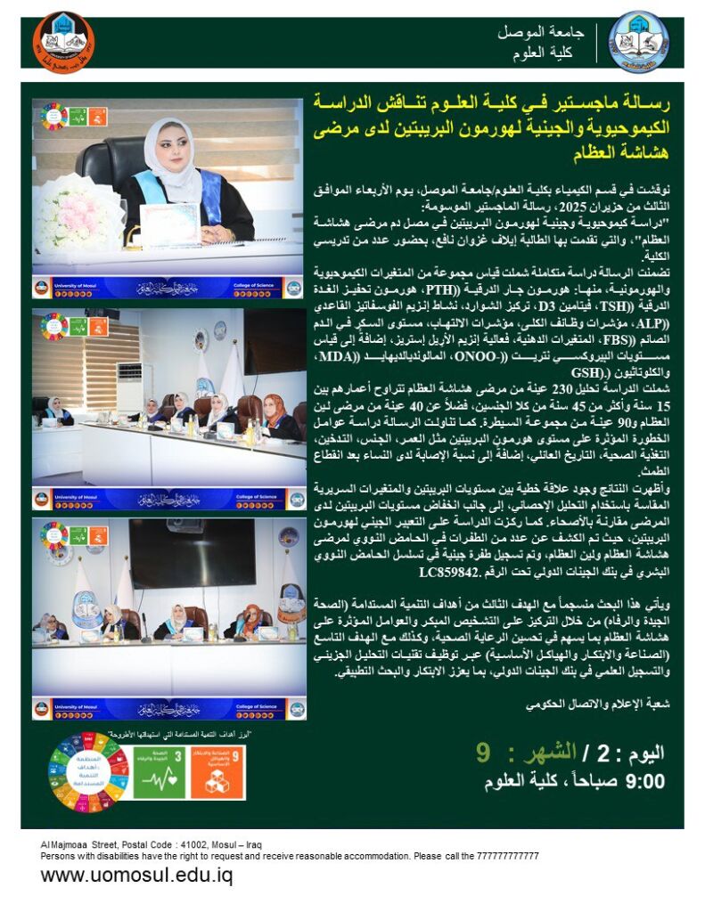 “Evaluation Biochemical and Molecular of Parkinson’s Disease patients in Mosul City”، للطالبة منار خضر أحمد علي من فرع علم الحيوان، بحضور رئيس القسم وعدد من تدريسيي الكلية.