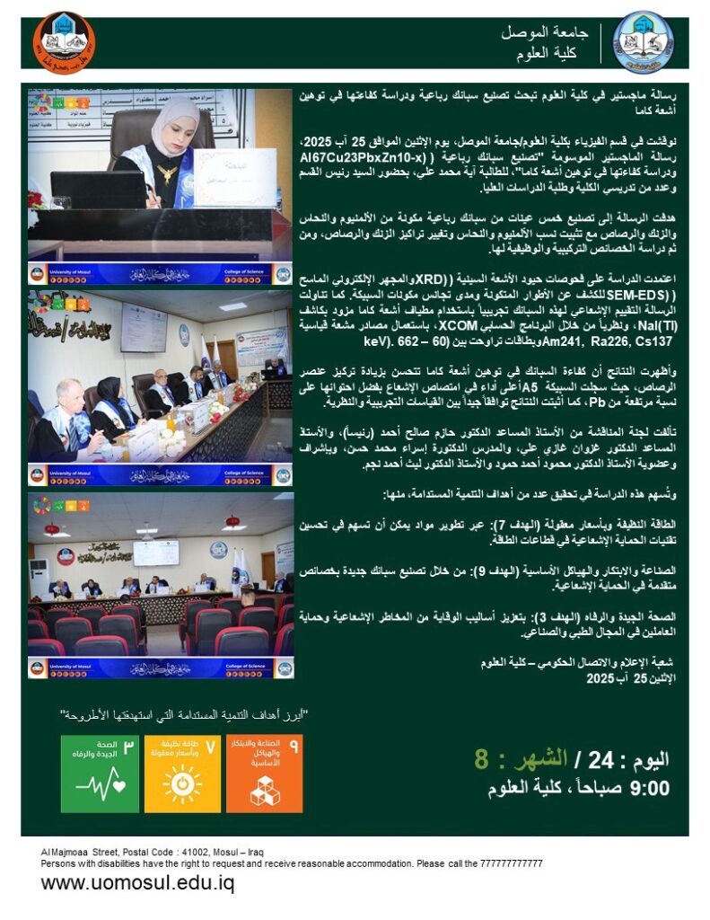 - مدن ومجتمعات مستدامة (الهدف 11): من خلال توفير قاعدة بيانات علمية تخدم الخطط التنموية والبيئية في محافظة نينوى.