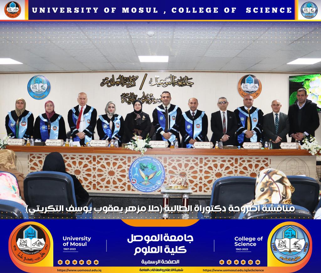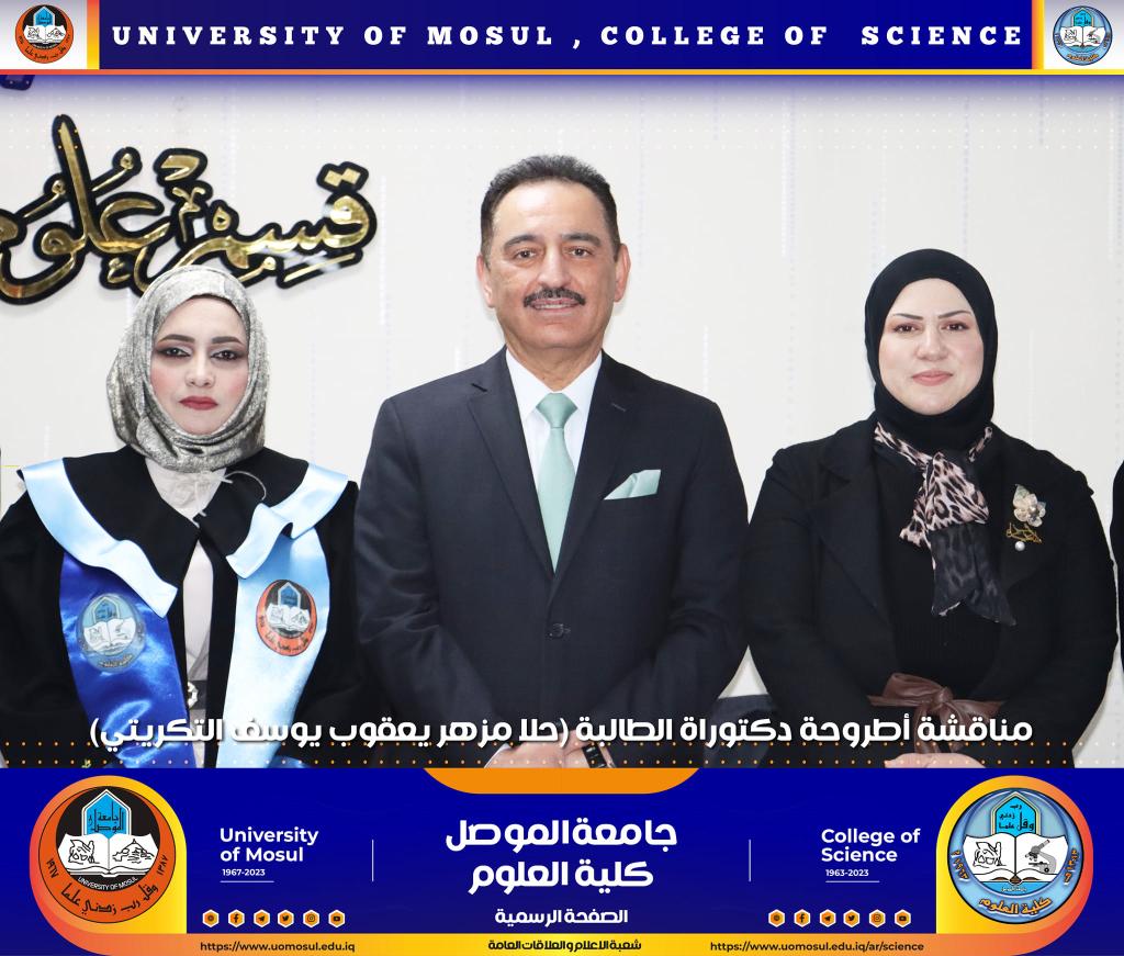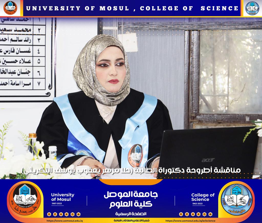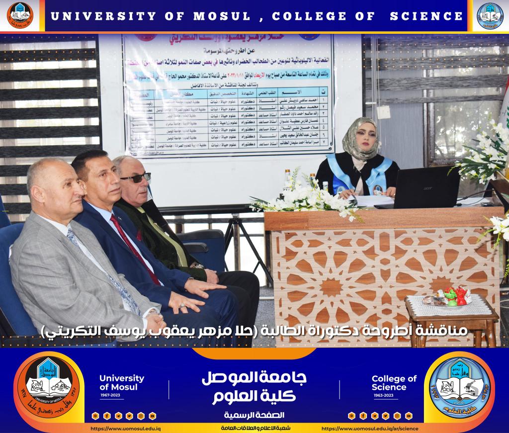 ناقش قسم علوم الحياة في كلية العلوم بجامعة الموصل أطروحة دكتوراه بعنوان “الفعالية الاليلوباثية لنوعين من الطحالب الخضراء وتأثيرها في بعض صفات النمو لثلاثة أصناف من الحنطة” يوم الأربعاء الموافق 11 كانون الثاني 2023.حضر جانباً منها السيد رئيس جامعة الموصل الأستاذ الدكتور قصي كمال الدين الأحمدي و السيدة عميد الكلية الأستاذ الدكتورة هيام عادل إبراهيم والسيد عميد كلية التربية للعلوم الصرفة الاستاذ المساعد الدكتور قيس إسماعيل إبراهيم والسادة معاوني العميد للشؤون العلمية و الإدارية وعدد من تدريسي الكلية.تناولت الدراسة التي تقدمت بها الطالبة (حلا مزهر يعقوب يوسف التكريتي) من فرع النبات عدد من المحاور منها : عزل وتحديد جنسين من الطحالب الخضراء الخيطية و تشخيصهما مظهرياً وجزيئياً وهما اﻟ glomerata Cladophora و maxima Spirogyra ، فصل وتشخيص المركبات الكيميائية الفعالة لكل من الطحلبين باستعمال تقانة كروماتوغرافيا الغاز- مطياف الكتلة(GC-MS) وكذلك تقانة الكروماتوغرافيا عالية الاداء (HPLC) ، و التحري عن امكانية تحويل مسحوق الطحلبين بأحجامهما المايكروية الى احجامهما النانوية باستعمال الطريقة الميكانيكيةتوصلت نتائج الدراسة الحالية إلى امكانية استعمال مستخلصات الطحلبين في الزراعة المستدامة لزيادة انتاجية محصول الحنطة فضلاً عن قدرتها على انتاج دقائق أكاسيد المعادن النانوية وكان افضلها تأثيراً في نمو أصناف الحنطة الناعمة طحلب glomerata Cladophora وعند التركيز 2% وكذلك دقائق اوكسيد المغنيسيوم النانوي عند التركيز 200 جزء بالمليون .ترأس لجنة المناقشة الأستاذ الدكتور أحمد ساهي درويش من الجامعة المستنصرية وعضوية كل من الأستاذ الدكتور محمد سعيد فيصل والأستاذ المساعد الدكتور رائد سالم أحمد داؤود والأستاذ المساعد الدكتور غسان فارس عطية علوان من جامعة سامراء و الأستاذ المساعد الدكتور علاء حسين علي شلال وبإشراف كل من الأستاذ الدكتورة جنان عبد الخالق سعيد والأستاذ المساعد الدكتورة مرا أسامة أحمد سليمان.شعبة الإعلام والعلاقات العامةالأربعاء 11 كانون الثاني 2023