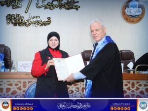 وفي ختام المناقشة، قدّمت السيدة عميد الكلية كتاب شكر وتقدير إلى الأستاذ الدكتور صاحب جمعة عبد الرحمن من كلية التربية للعلوم الصرفة / جامعة كركوك، تقديرًا لمشاركته في لجنة المناقشة.