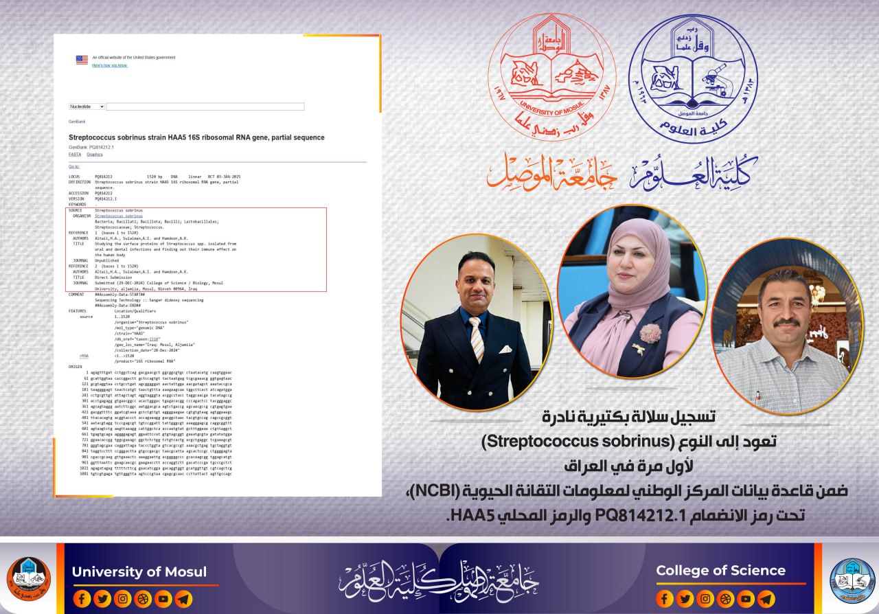 بتسجيل سُلالة بكتيرية تنتمي إلى النوع Streptococcus sobrinus، عُزلت من حالات التهابات وخراجات في جذور الأسنان لدى مرضى يُعانون من ضعف المناعة في مستشفيات مدينة الموصل، وقد تم اعتمادها رسميًّا في المركز الوطني لمعلومات التقانة الحيوية NCBI تحت الرمز: HAA5 PQ814212.1 .