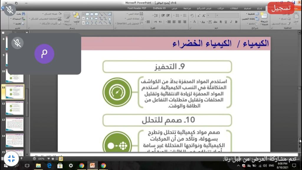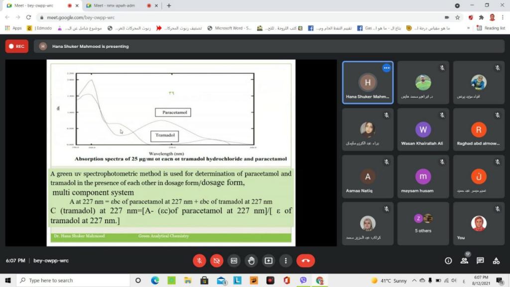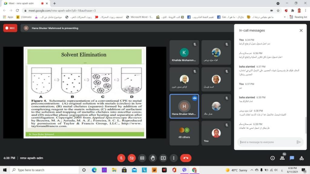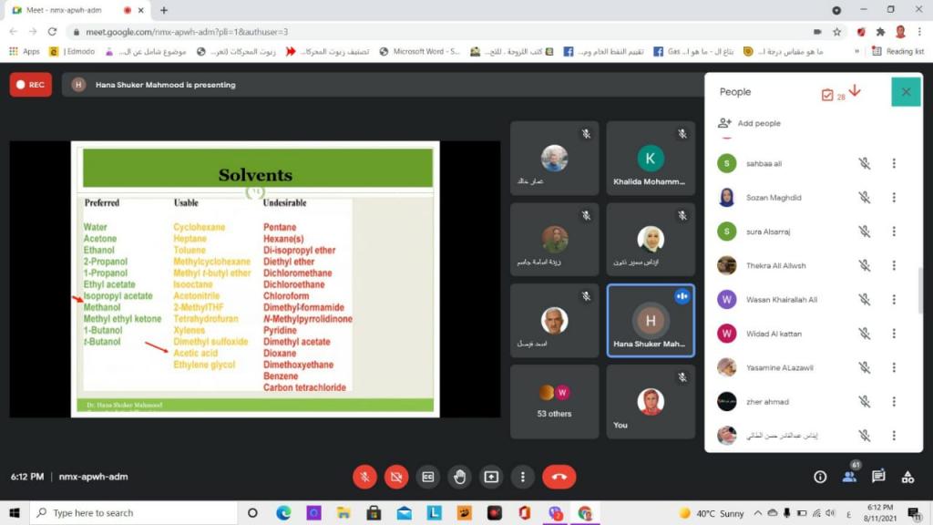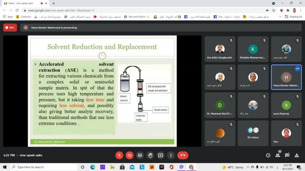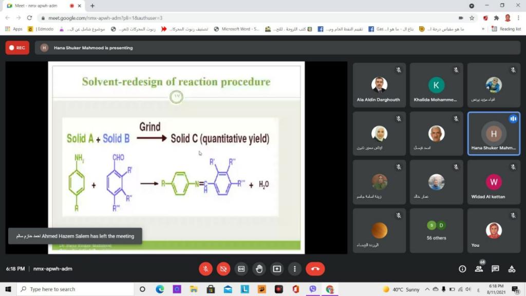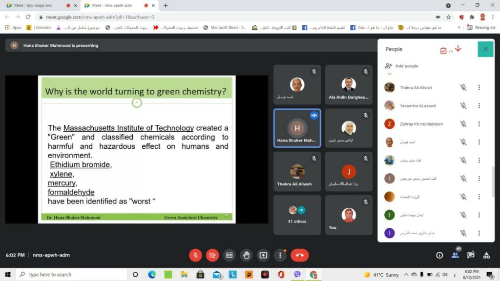اختتمت مساء يوم الخميس الموافق 12 آب 2021 أعمال الدورة التدريبية الإلكترونية التي أقامها قسم الكيمياء برعاية السيد رئيس جامعة الموصل الأستاذ الدكتور قصي كمال الدين الأحمدي و إشراف السيدة عميد كلية العلوم الأستاذ المساعد الدكتورة هيام عادل الطائي و الموسومة ” الكيمياء الخضراء ” القاها كلاً من ( أ.م.د. هناء شكر محمود ) و ( م.د. رنا عبدالمالك قبع ) .تناولت الدورة تعريف بالكيمياء الخضراء وتطبيقاتها والمبادئ الاثني عشر التي تقوم عليها ، كما قدمت الدورة تصنيف للمركبات الخطرة و الأقل خطراً وطرائق تصميم لتفاعلات كيميائية آمنه على صحة الإنسان والكائنات الأخرى وعلى سلامة البيئة و ذلك من خلال استخدام مذيبات آمنه والتقنين من الكواشف العضوية واعادة تدوير المخلفات ، كذلك تم تصنيف تقنيات التحليل والفصل والتقدير وتوضيح أيّها أكثر أمناً وأقل خطراً.شهدت الورشة حضوراً واسعاً من أكاديمي جامعة الموصل والجامعات العراقية فضلاً عن المؤسسة الصحية وطلبة الجامعة ، كما رافقها حدوث حوار نقاشي مستفيض .