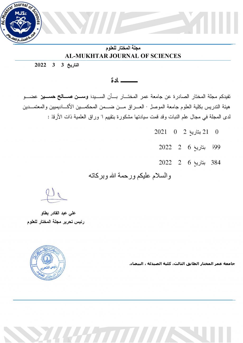 اختيرت الأستاذ المساعد الدكتورة ( وسن صالح حسين ) التدريسية في قسم علوم الحياة مقيم علمي في مجلة المختار للعلوم/ ليبيا .نبارك لها هذا التميز العلمي ، مع تمنياتنا لها ولكافة منتسبي كلية العلوم بالتقدم العلمي المستمر .