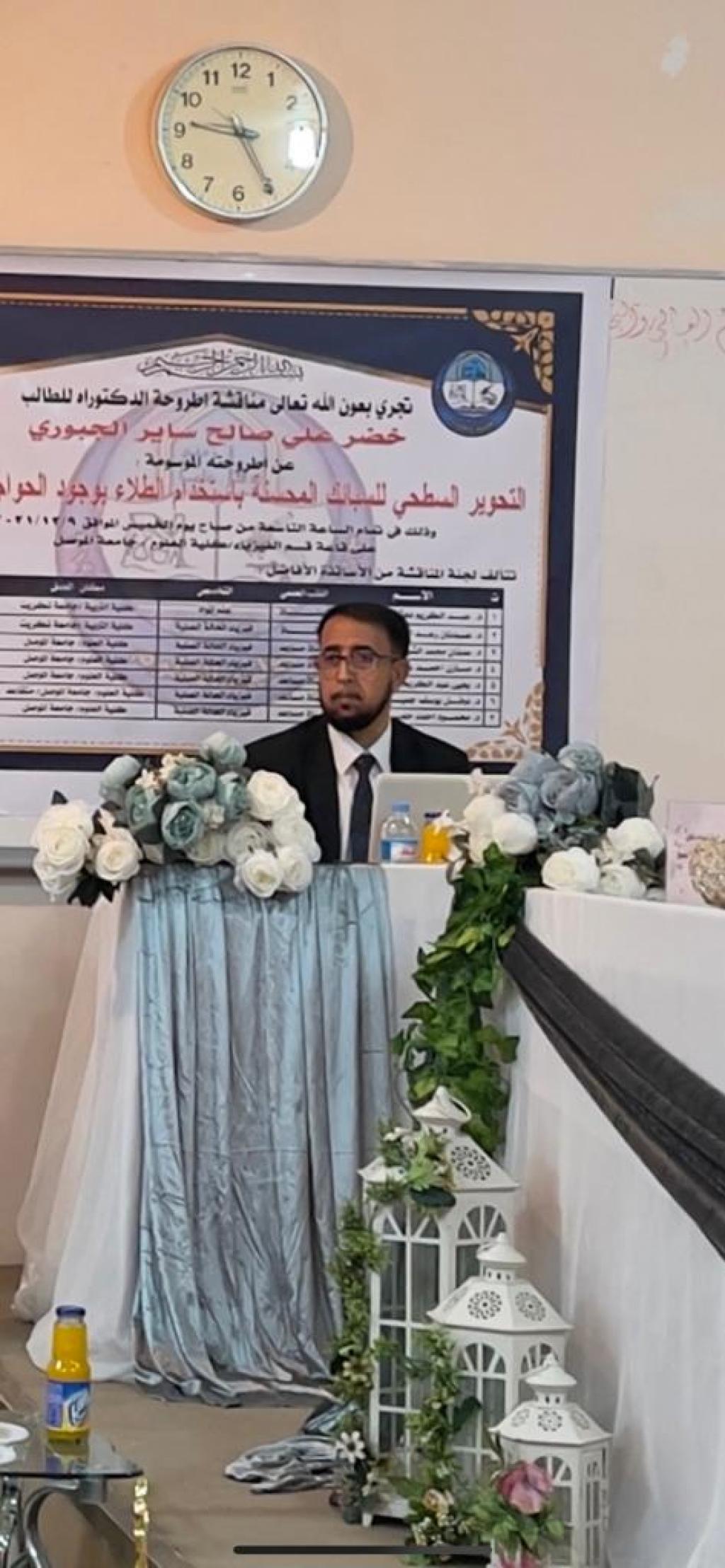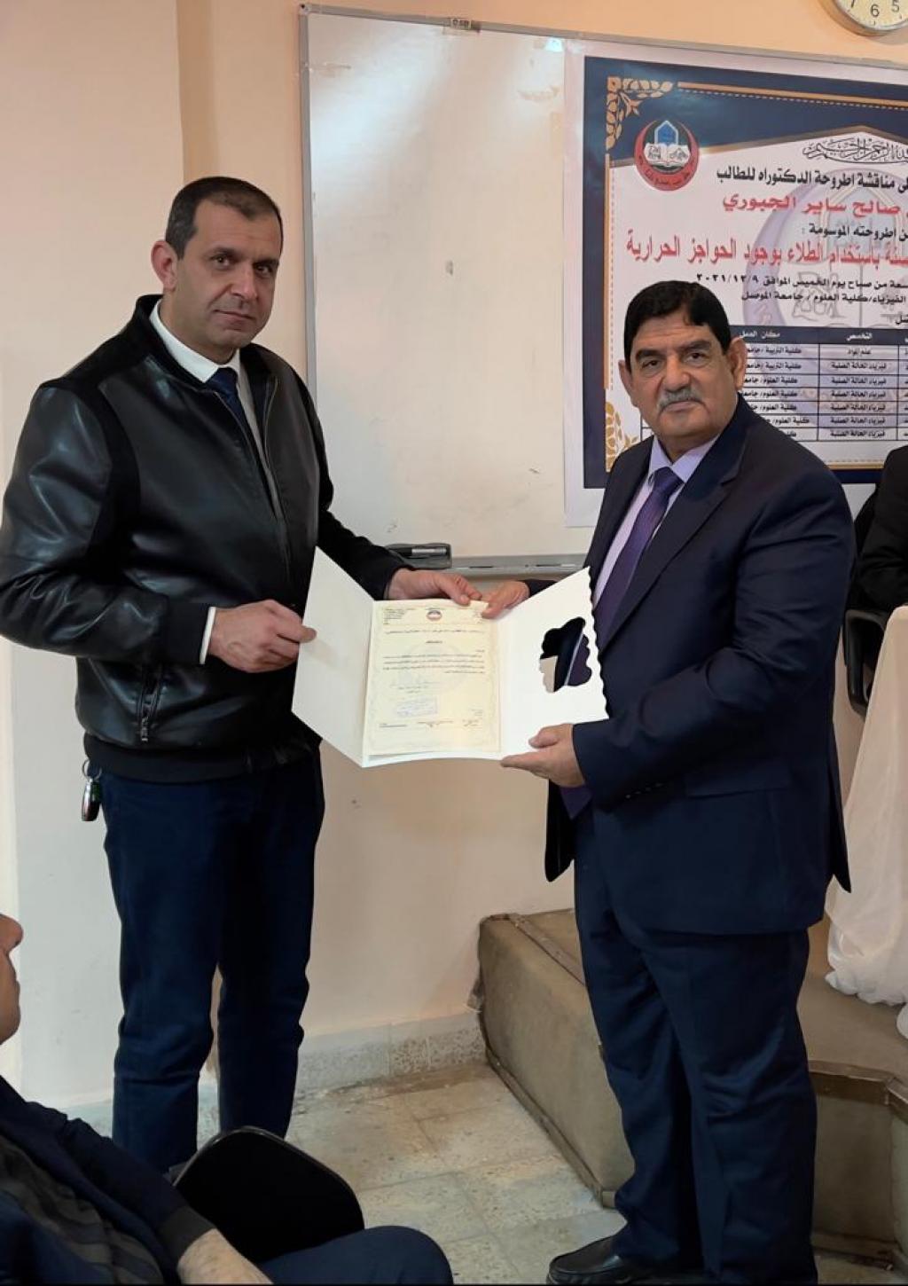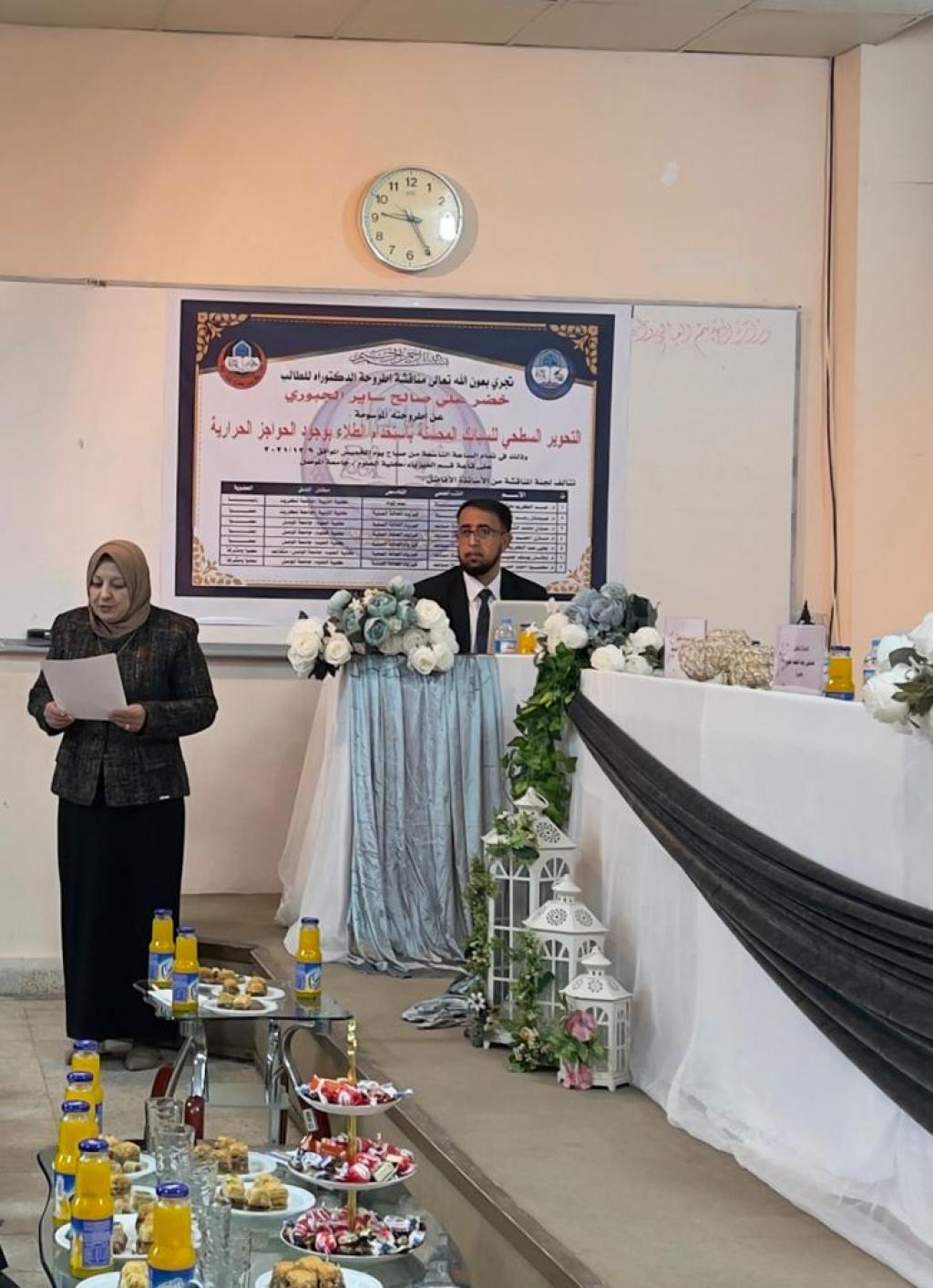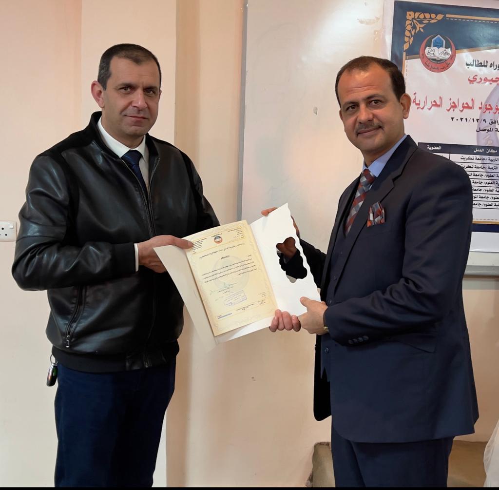 ناقشت كلية العلوم في جامعة الموصل يوم الخميس الموافق 9 كانون الأول 2021 اطروحة الدكتوراه الموسومة ” التحوير السطحي للسبائك المحسنة باستخدام الطلاء بوجود الحواجز الحرارية ” حضر جانباً منها المعاون الإداري الدكتور عمر عادل شريف نيابةً عن السيدة عميد الكلية الأستاذ المساعد الدكتورة هيام عادل إبراهيم الطائي .تناولت الاطروحة التي تقدم بها الطالب ( خضر علي صالح ساير الجبوري ) من قسم الفيزياء التحوير السطحي للسبائك المحسنة باستخدام الطلاء بوجود الحواجز الحرارية ، حيث تم استخدام ثلاث سبائك محسنة وهي الفولاذ المقاوم للصدأ 316 ذات اساس حديد والسبيكة المحسنة نوع IN 18 BV ذات أساس نيكل حديد والسبيكة المحسنة ذات اساس كوبلت FSX 414وذلك من خلال التعديل السطحي لها بواسطة الطلاء بالألمنيوم المنفرد والالمنيوم بوجود الحواجز الحرارية والتي هي اوكسيد التيتانيومTio2واوكسيد الزركونيوم ZrO2واوكسيد اليتيريوم Y2O3 وان طلاء السبائك بهذه المواد يعتبر تعديل سطحي لها وهو من الطرق الحديثة والتي تدخل في مجال هندسة الاسطح .ترأس لجنة المناقشة الاستاذ الدكتور عبدالكريم دهش محيمد وعضوية كلا من أ.د. عدنان رعد أحمد علي و أ.م.د. عدنان محمد الشيخ حسين و أ.م.د. مازن أحمد عبد غزال و أ.م.د. يحيي سلمان عبدالكريم وعضوية واشراف كلا من أ.م .د. نوفل يوسف جميل و أ.م .د. محمود أحمد حمود داؤود .قدّم السيد معاون العميد نيابةً عن السيدة عميد الكلية كتاب شكر وتقدير إلى الدكتور عبدالكريم دهش محيمد و الدكتور عدنان رعد أحمد علي من كلية التربية / جامعة تكريت ؛ لتكبدهما عناء السفر وحضور المناقشة .