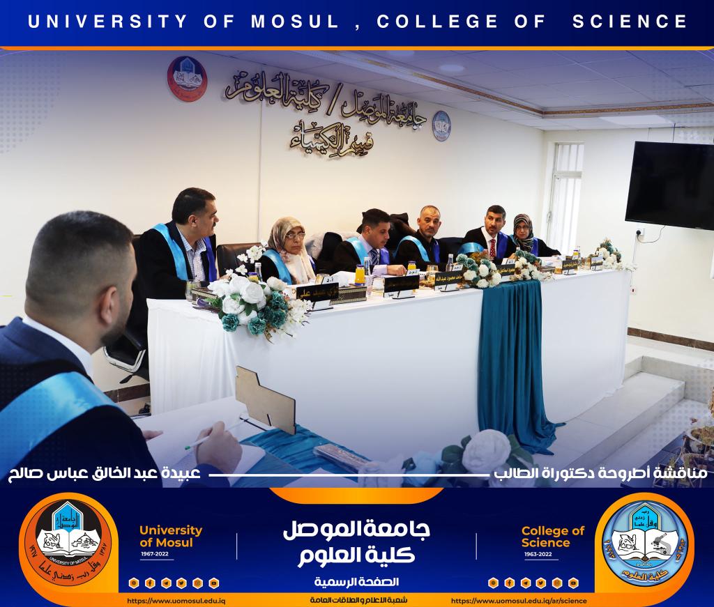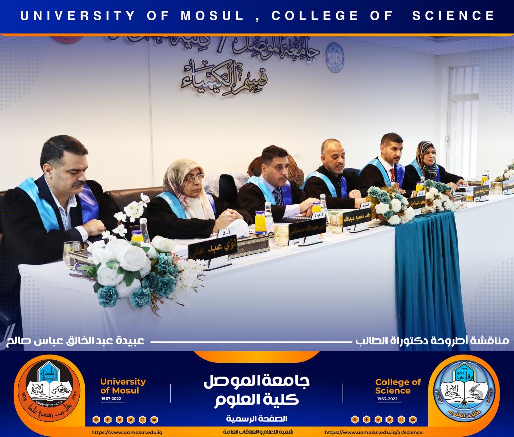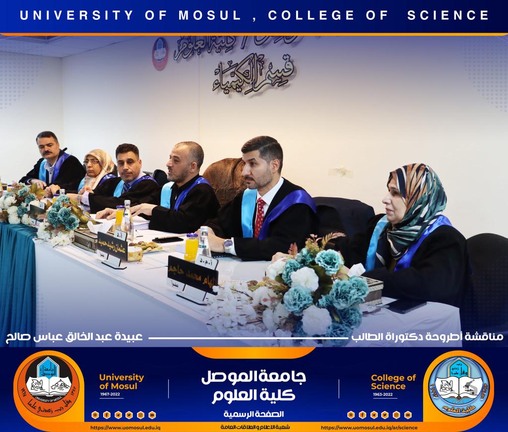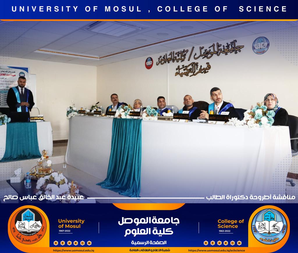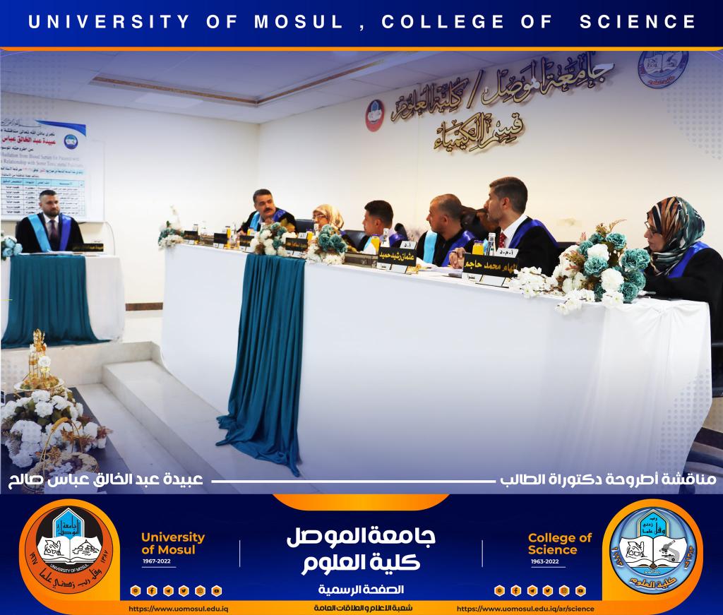 ناقش قسم الكيمياء في كلية العلوم بجامعة الموصل أطروحة الدكتوراه الموسومة ” دراسة مستوى المدكاين وعزله من مصل الدم لدى مرضى القلب والأوعية الدموية وعلاقته مع بعض الملوثات المعدنية السامة ” يوم الإثنين الموافق 5 كانون الأول 2022.حضر جانباً منها الأستاذ الدكتورة هيام عادل إبراهيم عميد الكلية والسيد المعاون الإداري والسيد رئيس القسم وعدد من تدريسي الكلية.تناولت الاطروحة التي تقدم بها الطالب ( عبيدة عبد الخالق عباس ) في فرع الكيمياء الحياتية ، دراسة على ميدكاين (MK) لمرضى أمراض القلب والأوعية الدموية (CVD) ، والمرضى في الدراسة تم تشخيصهم إكلينيكيًا بتصلب الشرايين (AP) ، واحتشاء عضلة القلب (MI) وفشل القلب (HF) ، بالإضافة إلى تقدير (25) متغير من متغيرات الكيموحيوية.أظهرت النتائج وجود زيادة معنوية في مستوى MK لمرضى AP وMI و HFخاصة عند الذكور من مجموعة مرضى MI. لوحظ انخفاض في المعادن الأساسية (الكالسيوم ، المغنيسيوم والحديد) في المرضى CVD ، خاصةً في مجموعة المرضى MI الإناث. وهناك مستويات عالية من المعادن الثقيلة مثل As وHg وCd في CVD خاصة في مجموعة مرضى APs مقارنة بمجموعة الاصحاء.أشارت النتائج إلى عدم وجود تأثير في العامل الوراثي لدى المرضى CVD، فقط هناك زيادة في مستويات ALT و ALP وانخفاض في Hg و GSH في المرضى الذين ليس لديهم تاريخ وراثي. لوحظ ان هناك تحسن جزئي في حالة المرضى الذين يعانون من أمراض القلب والأوعية الدموية والذين خضعوا لعمليات جراحية ، مقارنة بالمرضى الذين لم يخضعوا لأي عمليات جراحية.ترأس لجنة المناقشة الأستاذ الدكتور محمود إسماعيل حسن وعضوية كل من الأستاذ الدكتور عثمان رشيد حميد من جامعة سامراء و الأستاذ المساعد الدكتورة ليلى عبد الله مصطفى والأستاذ المساعد الدكتورة الهام محمد حاجم والأستاذ المساعد الدكتور حامد محمود عبد الله من جامعة دهوك ، وبإشراف وعضوية الأستاذ الدكتور لؤي عبد علي الهلالي.شعبة الإعلام والعلاقات العامةالإثنين 5 كانون الأول 2022