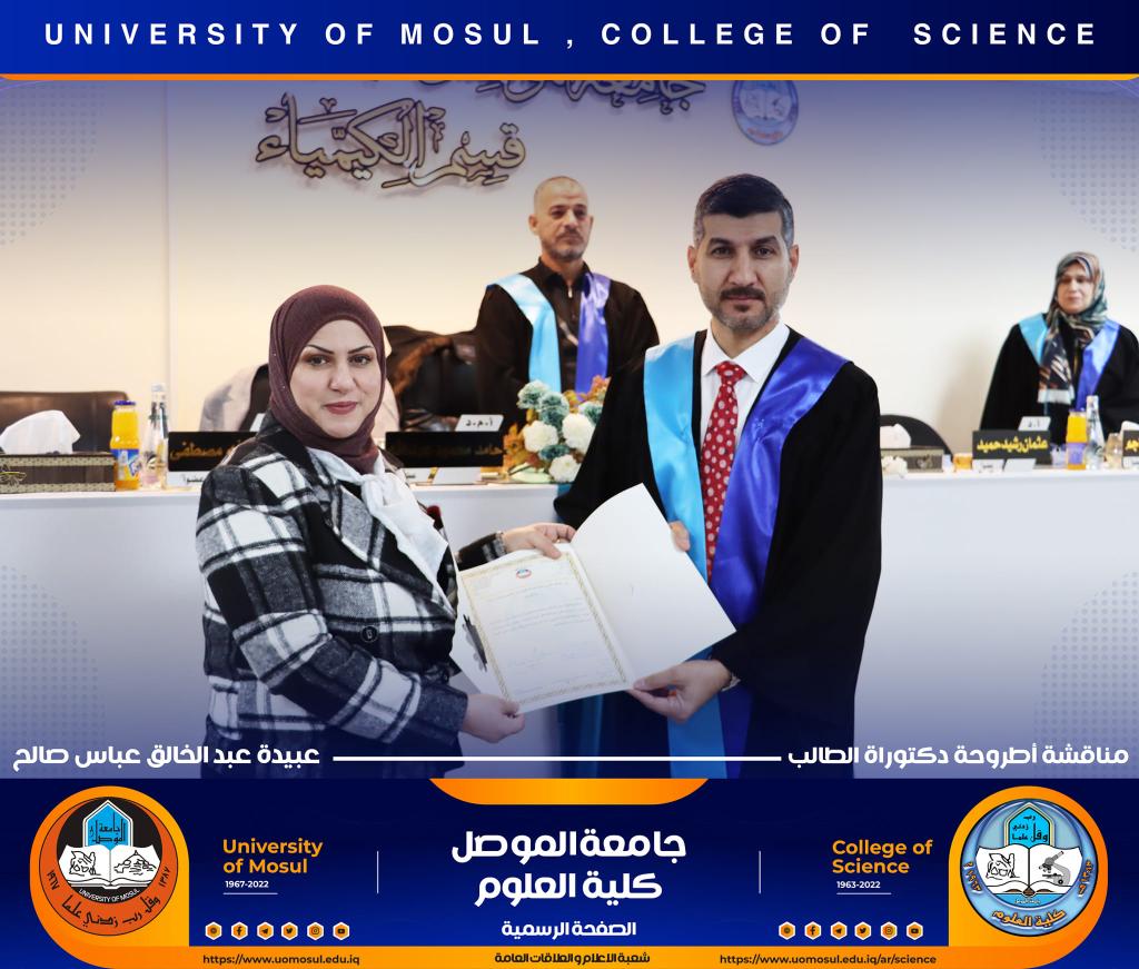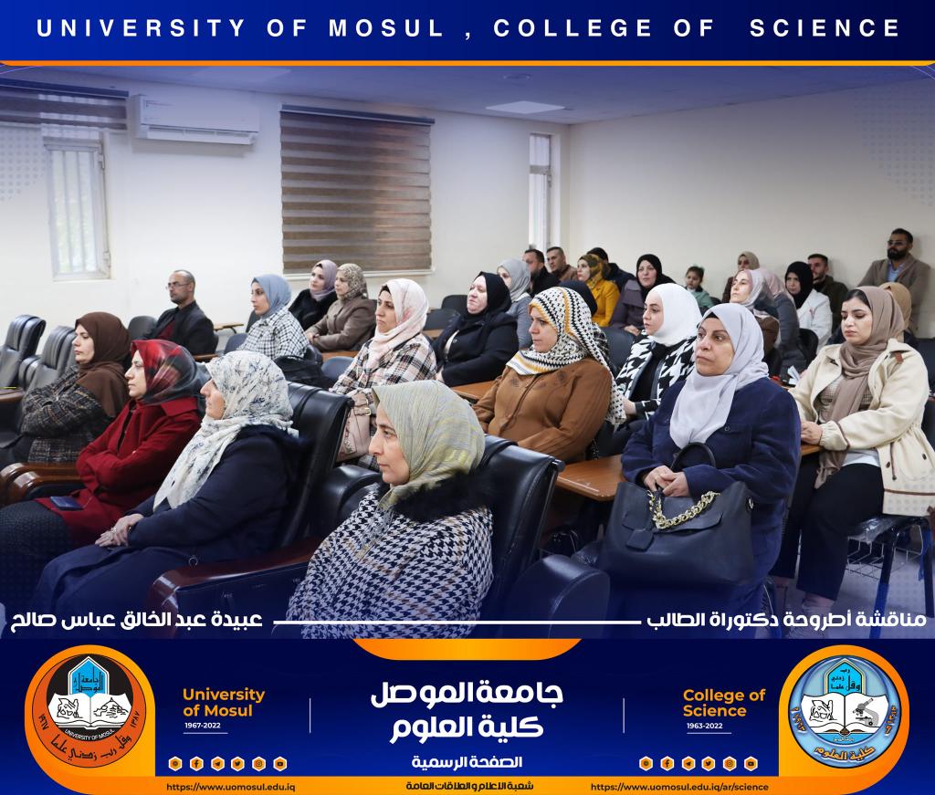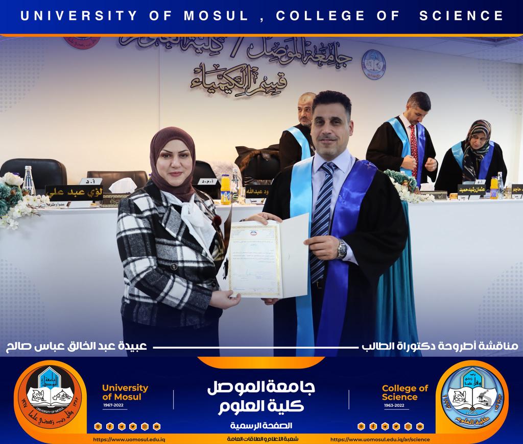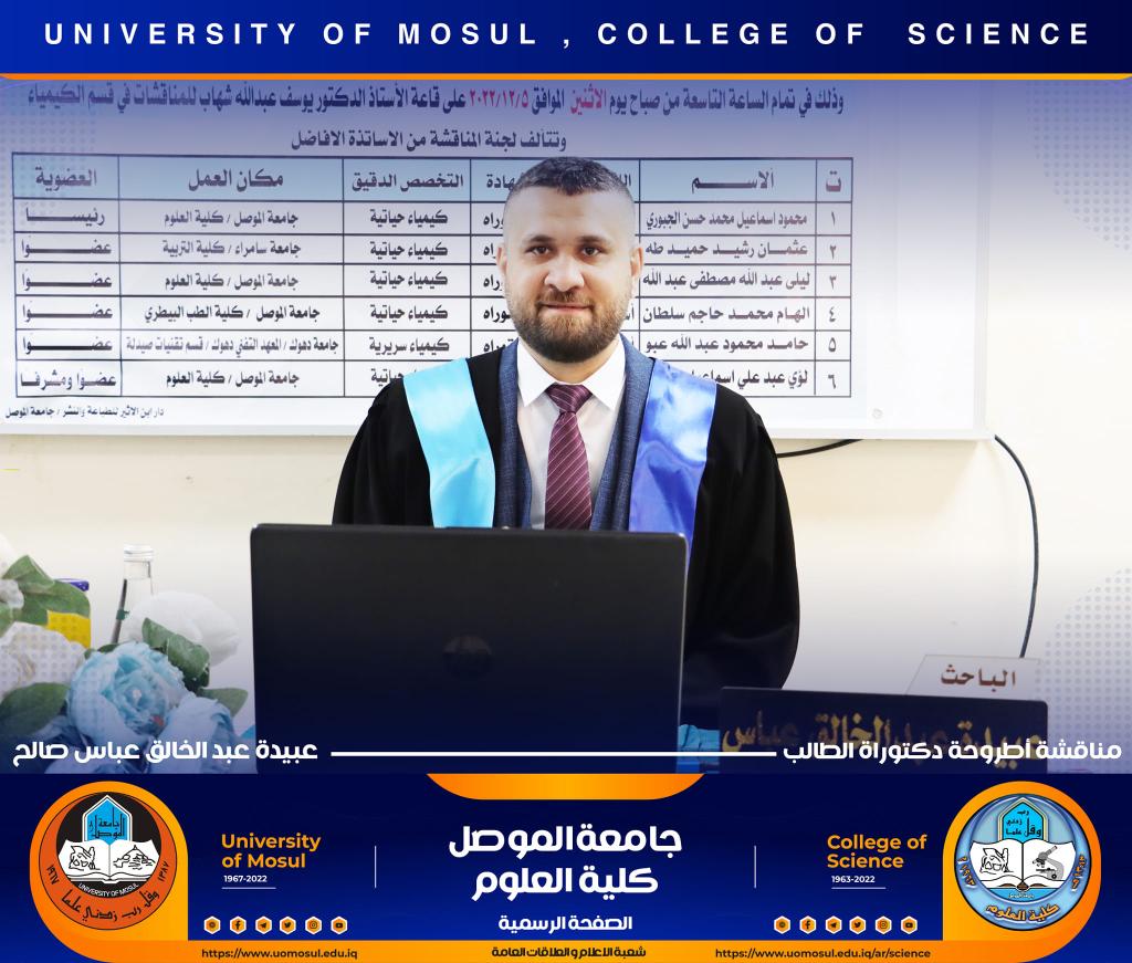 ناقش قسم الكيمياء في كلية العلوم بجامعة الموصل أطروحة الدكتوراه الموسومة ” دراسة مستوى المدكاين وعزله من مصل الدم لدى مرضى القلب والأوعية الدموية وعلاقته مع بعض الملوثات المعدنية السامة ” يوم الإثنين الموافق 5 كانون الأول 2022.حضر جانباً منها الأستاذ الدكتورة هيام عادل إبراهيم عميد الكلية والسيد المعاون الإداري والسيد رئيس القسم وعدد من تدريسي الكلية.تناولت الاطروحة التي تقدم بها الطالب ( عبيدة عبد الخالق عباس ) في فرع الكيمياء الحياتية ، دراسة على ميدكاين (MK) لمرضى أمراض القلب والأوعية الدموية (CVD) ، والمرضى في الدراسة تم تشخيصهم إكلينيكيًا بتصلب الشرايين (AP) ، واحتشاء عضلة القلب (MI) وفشل القلب (HF) ، بالإضافة إلى تقدير (25) متغير من متغيرات الكيموحيوية.أظهرت النتائج وجود زيادة معنوية في مستوى MK لمرضى AP وMI و HFخاصة عند الذكور من مجموعة مرضى MI. لوحظ انخفاض في المعادن الأساسية (الكالسيوم ، المغنيسيوم والحديد) في المرضى CVD ، خاصةً في مجموعة المرضى MI الإناث. وهناك مستويات عالية من المعادن الثقيلة مثل As وHg وCd في CVD خاصة في مجموعة مرضى APs مقارنة بمجموعة الاصحاء.أشارت النتائج إلى عدم وجود تأثير في العامل الوراثي لدى المرضى CVD، فقط هناك زيادة في مستويات ALT و ALP وانخفاض في Hg و GSH في المرضى الذين ليس لديهم تاريخ وراثي. لوحظ ان هناك تحسن جزئي في حالة المرضى الذين يعانون من أمراض القلب والأوعية الدموية والذين خضعوا لعمليات جراحية ، مقارنة بالمرضى الذين لم يخضعوا لأي عمليات جراحية.ترأس لجنة المناقشة الأستاذ الدكتور محمود إسماعيل حسن وعضوية كل من الأستاذ الدكتور عثمان رشيد حميد من جامعة سامراء و الأستاذ المساعد الدكتورة ليلى عبد الله مصطفى والأستاذ المساعد الدكتورة الهام محمد حاجم والأستاذ المساعد الدكتور حامد محمود عبد الله من جامعة دهوك ، وبإشراف وعضوية الأستاذ الدكتور لؤي عبد علي الهلالي.شعبة الإعلام والعلاقات العامةالإثنين 5 كانون الأول 2022