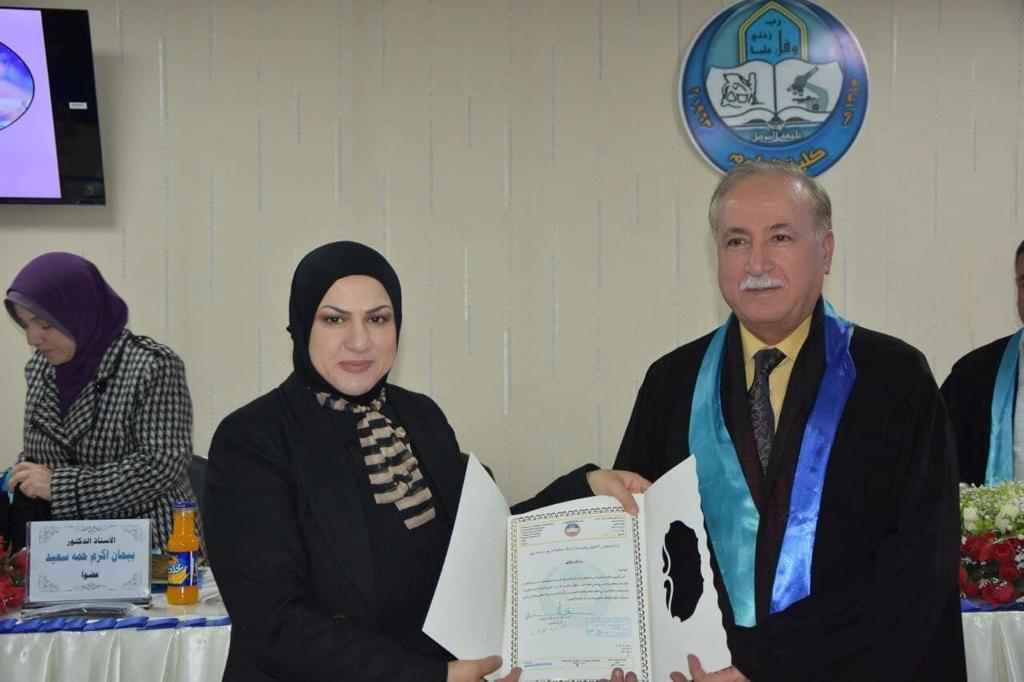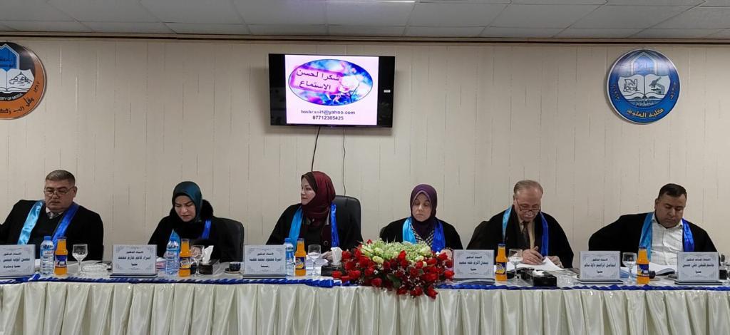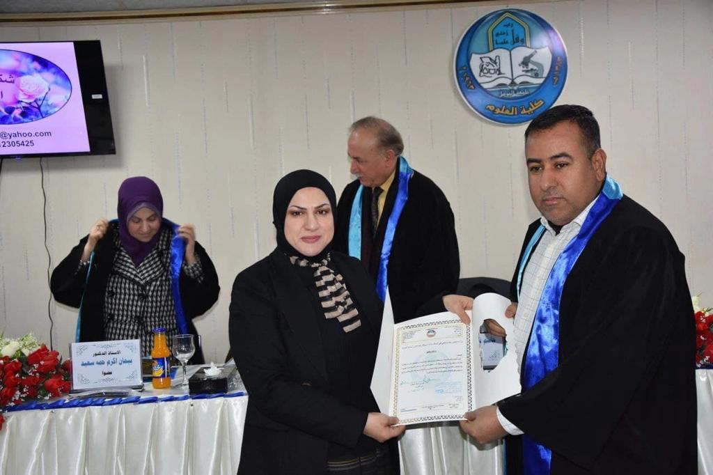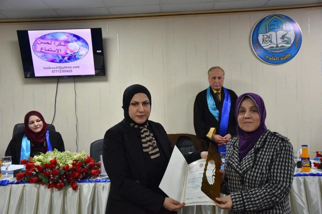 - دراسة قدرة مواد التثبيط المختارة على تثبيط التعبير الجيني للجين Sea والتحري عن حصول تثبيط التعبير الجيني باستخدام الطرق الجزيئية. ترأس لجنة المناقشة الأستاذ الدكتورة أميرة محمود محمد وعضوية كل من الأستاذ الدكتورة اسراء غانم حازم محمد و الأستاذ الدكتورة بيمان أكرم حمه سعيد و الأستاذ الدكتور إسماعيل ابراهيم داؤد والأستاذ المساعد الدكتور جاسم فتحي علي حسين و بإشراف وعضوية كل من الأستاذ الدكتور محسن أيوب عيسى أحمد من كلية العلوم / جامعة الموصل و الأستاذ المساعد الدكتور مجيد ارشيد سباح جبار من جامعة النهرين.قدمت السيدة عميد الكلية كتاب شكر للأستاذ الدكتورة بيمان أكرم حمه سعيد / جامعة صلاح الدين ، و للأستاذ المساعد الدكتور جاسم فتحي علي حسين / جامعة الحمدانية لتكبدهم عناء السفر و حضور مناقشة الطالبة .و الأستاذ الدكتور إسماعيل إبراهيم داؤد / جامعة نينوى للمشاركة في مناقشة الطالبة .