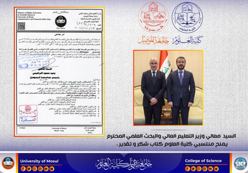 نوقشت في قسم علوم الحياة بكلية العلوم / جامعة الموصل اطروحة الدكتوراه الموسومة ” دراسة مظهرية وجزيئية لعوامل ضراوة الإشريكية القولونية المعزولة من الفلورا الطبيعية والمصادر السريرية في الإنسان ” يوم الأحد الموافق 29 كانون الأول 2024 ترأست لجنة مناقشتها السيدة عميد الكلية الأستاذ الدكتورة هيام عادل إبراهيم المحترمة و حضر جانباً منها السادة معاونا العميد للشؤون العلمية والإدارية والسيد رئيس القسم وعدد من تدريسيي الكلية المحترمين .