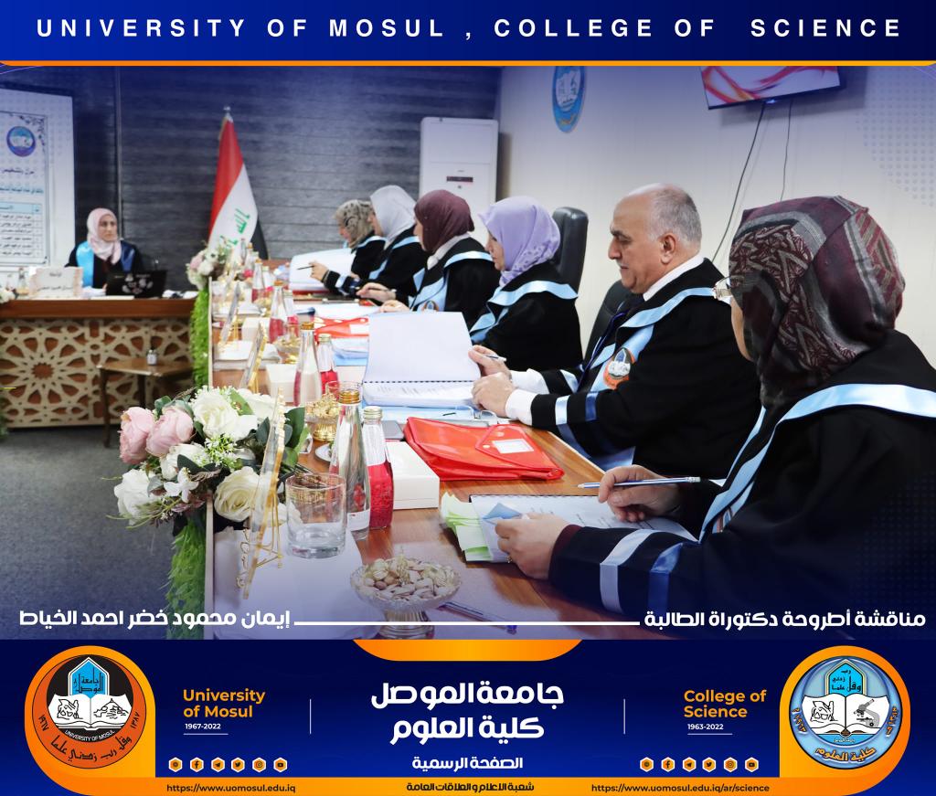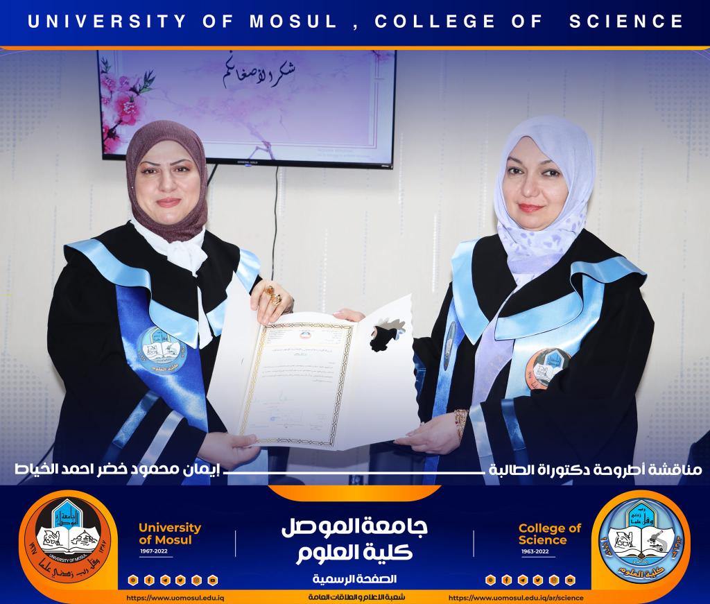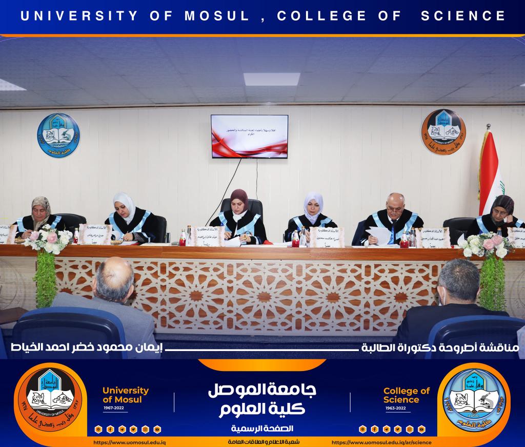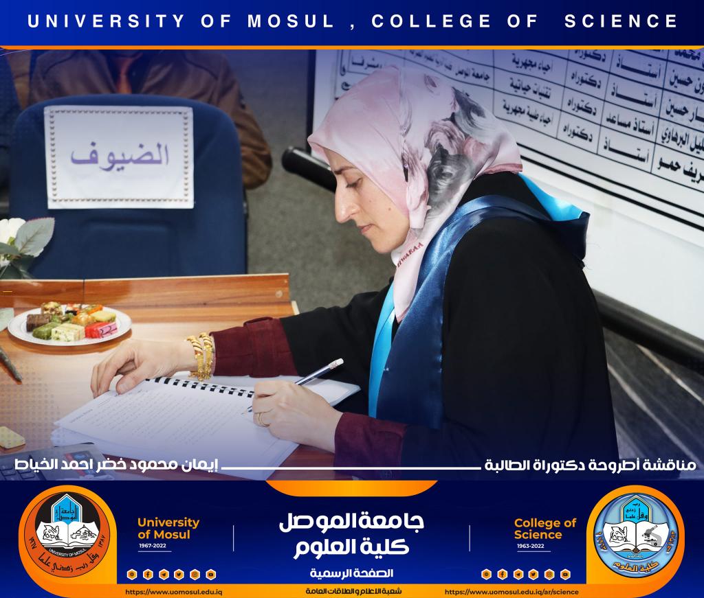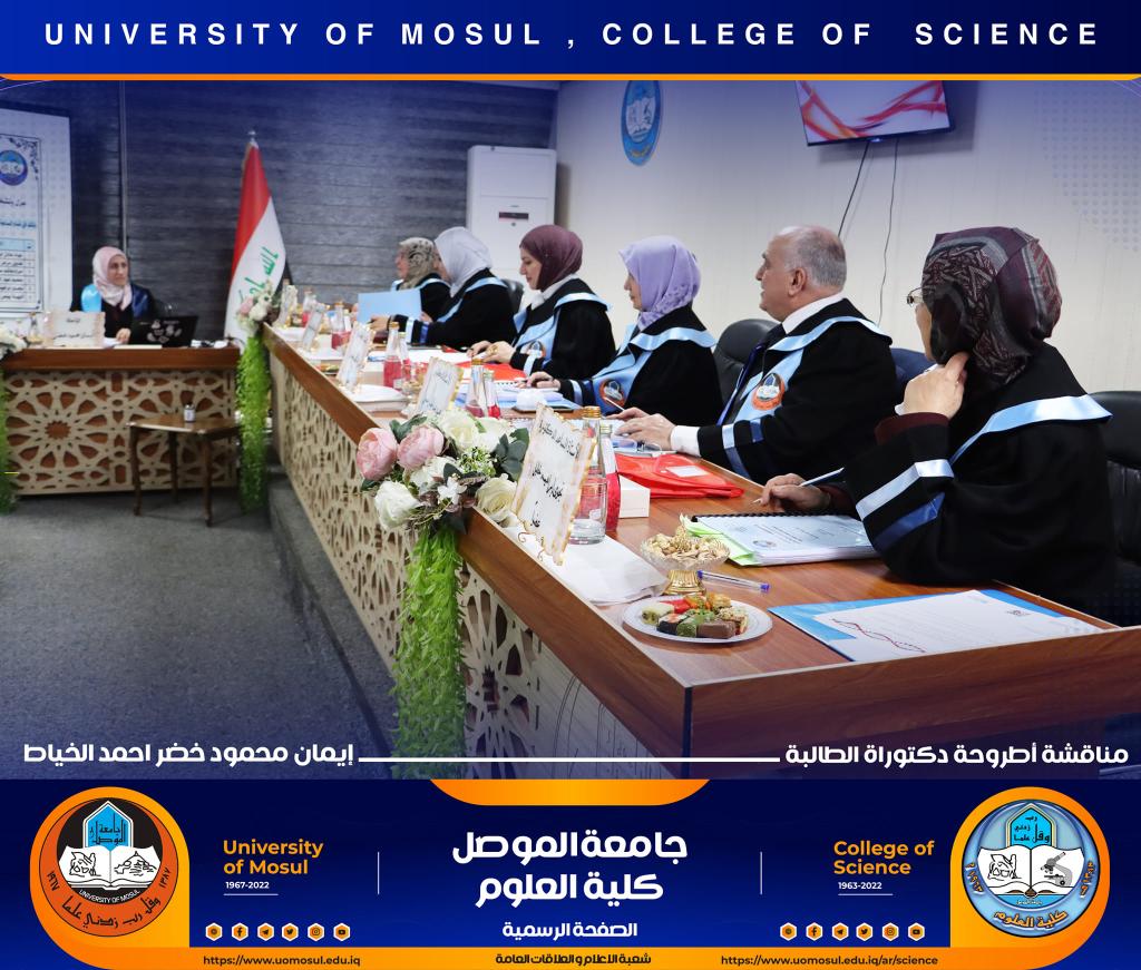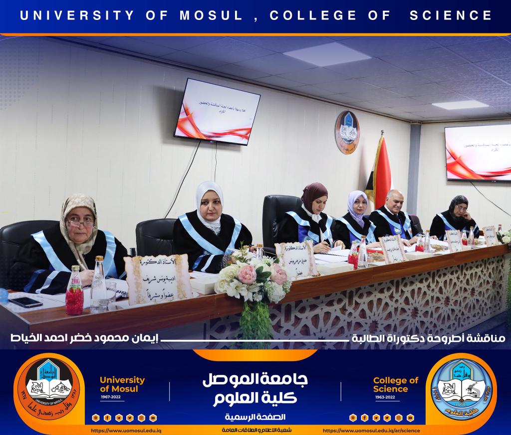 ناقش قسم علوم الحياة في كلية العلوم / جامعة الموصل اطروحة الدكتوراه الموسومة ” عزل وتشخيص البكتريا Aggregatibacter actinomycetemcomitans ودراسة الفعالية البايولوجية للسموم المنتجة منها ” يوم الخميس الموافق 15 كانون الأول 2022.ترأس لجنتها السيد عميد كلية العلوم الأستاذ الدكتورة هيام عادل إبراهيم وحضر جانباً منها السيد رئيس القسم و عدد من تدريسي الكلية.تناولت الدراسة التي تقدمت بها الطالبة ( إيمان محمود خضر ) / فرع علم الأحياء المجهرية عدد من المحاور اذ تضمنت عزل البكتريا Aggregatibacter actinomycetemcomitans من الأشخاص المصابين بمختلف الأعمار التي تراوحت من مرحلة ما قبل المراهقة ومرحلة الكهولة ، و تأكيد تشخيص البكتريا جينيا وبالاعتماد على الكشف عن النمط المصلي b وامتلاكها للجين cagE وللجين ltxA.تمكنت الدراسة من فصل ذيفان خلايا الدم البيض وتنقيته جزئيا باستخدام تقنية كروماتوغرافيا العمود و دراسة تأثيره في السيطرة على نمو الخلايا الزرعية لخط خلايا ابيضاض الدم مقارنة بالعقار الكيميائي Azacitidine المستخدم في العلاج.ترأس لجنة المناقشة الأستاذ الدكتورة هيام عادل إبراهيم الطائي وعضوية كل من الأستاذ الدكتورة هديل مزهر يونس محمد من جامعة تكريت و الأستاذ الدكتورة إسراء هاشم سعدون حسين من جامعة تكريت والأستاذ الدكتور محمود عبد الجبار حسين والأستاذ المساعد الدكتورة نجوى إبراهيم خليل البرهاوي و بإشراف الأستاذ الدكتورة أديبة يونس شريف حمو.شعبة الإعلام والعلاقات العامةالجمعة 16 كانون الأول 2022