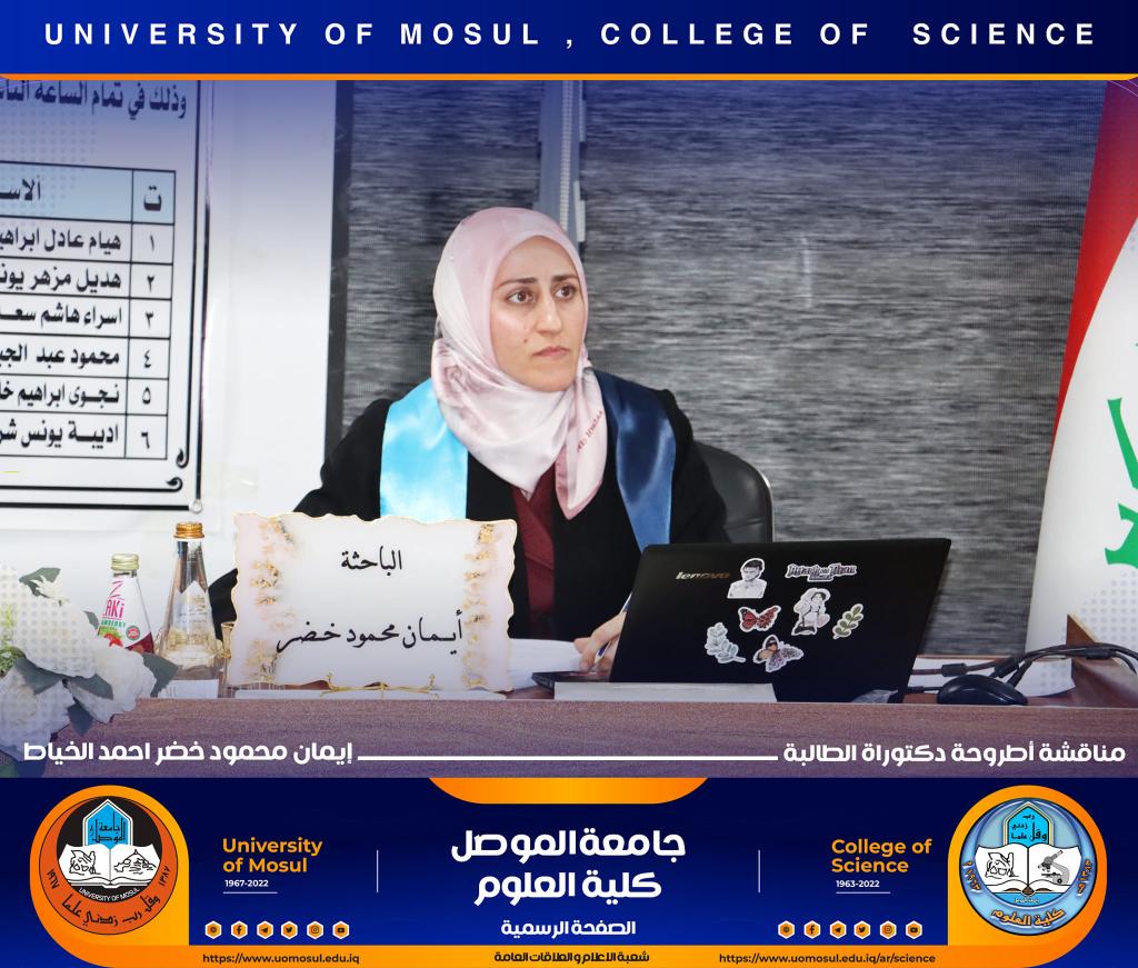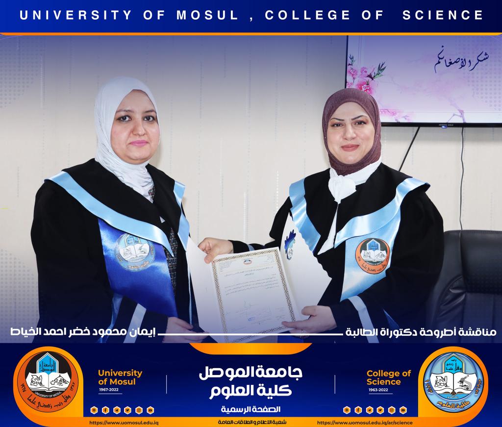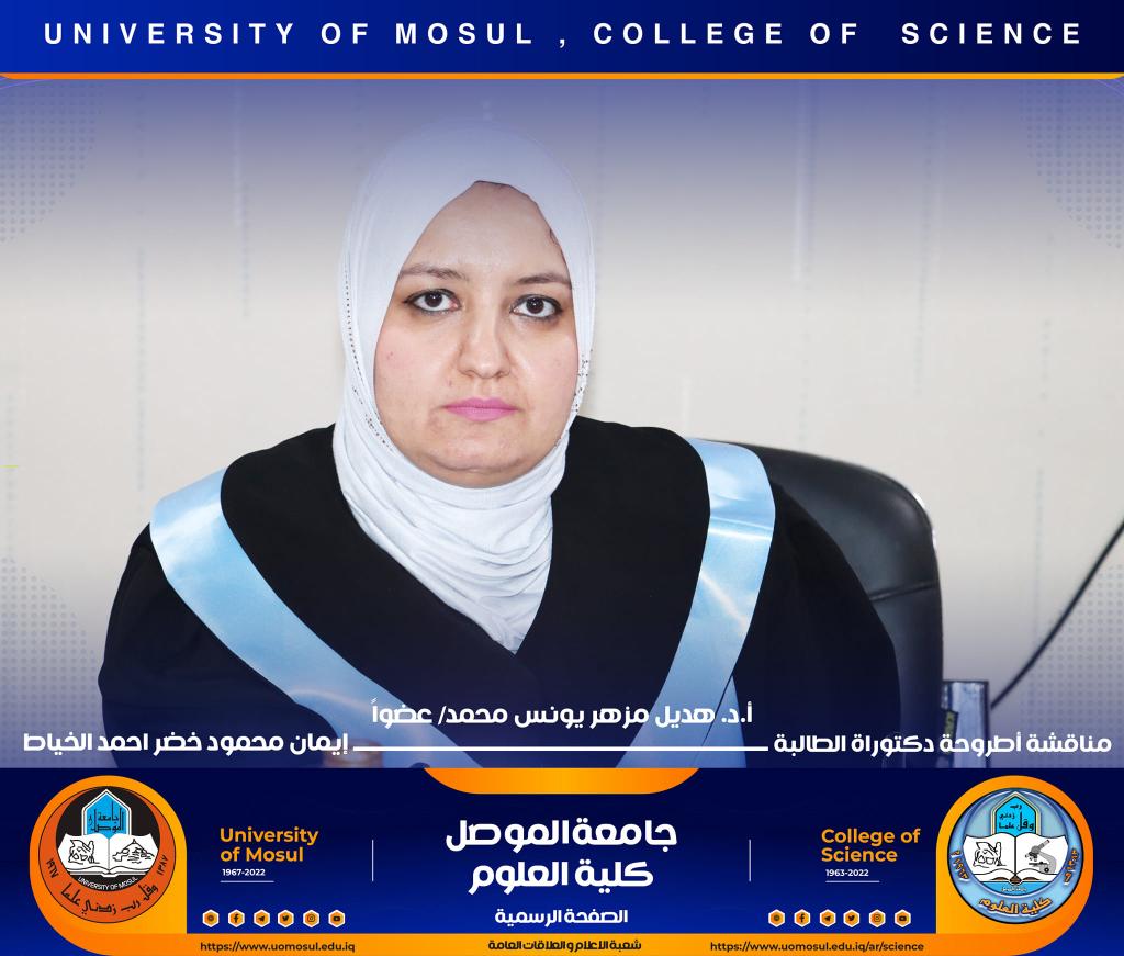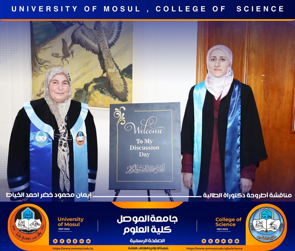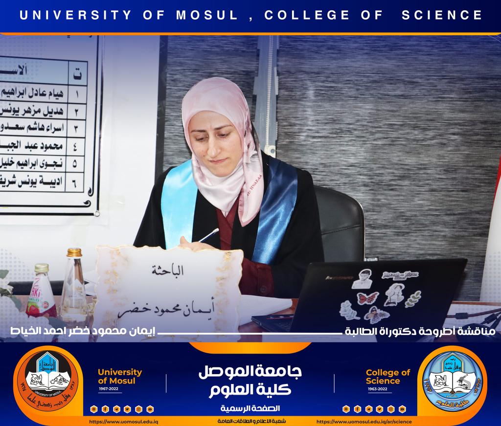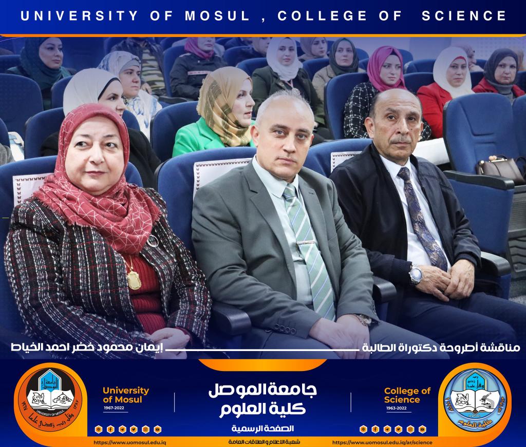 ناقش قسم علوم الحياة في كلية العلوم / جامعة الموصل اطروحة الدكتوراه الموسومة ” عزل وتشخيص البكتريا Aggregatibacter actinomycetemcomitans ودراسة الفعالية البايولوجية للسموم المنتجة منها ” يوم الخميس الموافق 15 كانون الأول 2022.ترأس لجنتها السيد عميد كلية العلوم الأستاذ الدكتورة هيام عادل إبراهيم وحضر جانباً منها السيد رئيس القسم و عدد من تدريسي الكلية.تناولت الدراسة التي تقدمت بها الطالبة ( إيمان محمود خضر ) / فرع علم الأحياء المجهرية عدد من المحاور اذ تضمنت عزل البكتريا Aggregatibacter actinomycetemcomitans من الأشخاص المصابين بمختلف الأعمار التي تراوحت من مرحلة ما قبل المراهقة ومرحلة الكهولة ، و تأكيد تشخيص البكتريا جينيا وبالاعتماد على الكشف عن النمط المصلي b وامتلاكها للجين cagE وللجين ltxA.تمكنت الدراسة من فصل ذيفان خلايا الدم البيض وتنقيته جزئيا باستخدام تقنية كروماتوغرافيا العمود و دراسة تأثيره في السيطرة على نمو الخلايا الزرعية لخط خلايا ابيضاض الدم مقارنة بالعقار الكيميائي Azacitidine المستخدم في العلاج.ترأس لجنة المناقشة الأستاذ الدكتورة هيام عادل إبراهيم الطائي وعضوية كل من الأستاذ الدكتورة هديل مزهر يونس محمد من جامعة تكريت و الأستاذ الدكتورة إسراء هاشم سعدون حسين من جامعة تكريت والأستاذ الدكتور محمود عبد الجبار حسين والأستاذ المساعد الدكتورة نجوى إبراهيم خليل البرهاوي و بإشراف الأستاذ الدكتورة أديبة يونس شريف حمو.شعبة الإعلام والعلاقات العامةالجمعة 16 كانون الأول 2022