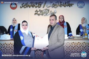 وفي ختام المناقشة، قدّم السيد المعاون الإداري ونيابةً عن السيدة عميد الكلية الأستاذ الدكتورة هيام عادل إبراهيم، كتاب شكر وتقدير إلى الأستاذ الدكتور نادية أحمد صالح محمد من كلية التربية للعلوم الصرفة / جامعة تكريت، تثمينًا لجهودها العلمية ومشاركتها الفاعلة في المناقشة.