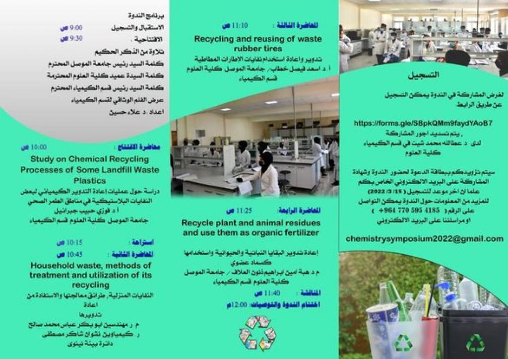 هو عنوان الندوة الجديدة في كلية العلوم التي يرعاها السيد رئيس جامعة الموصل الأستاذ الدكتور قصي كمال الدين الاحمدي المحترم ، وتحت اشراف السيدة العميد الأستاذ الدكتورة هيام عادل ابراهيم المحترمة ، يقيمها قسم الكيمياء بكليتنا في السادس عشر من شهر آذار 2022 في تمام الساعة التاسعة والنصف صباحاً على رحاب قاعة المؤتمرات في القسم .مزيداً من التفاصيل تجدونها في البروشور الخاص بالندوة :