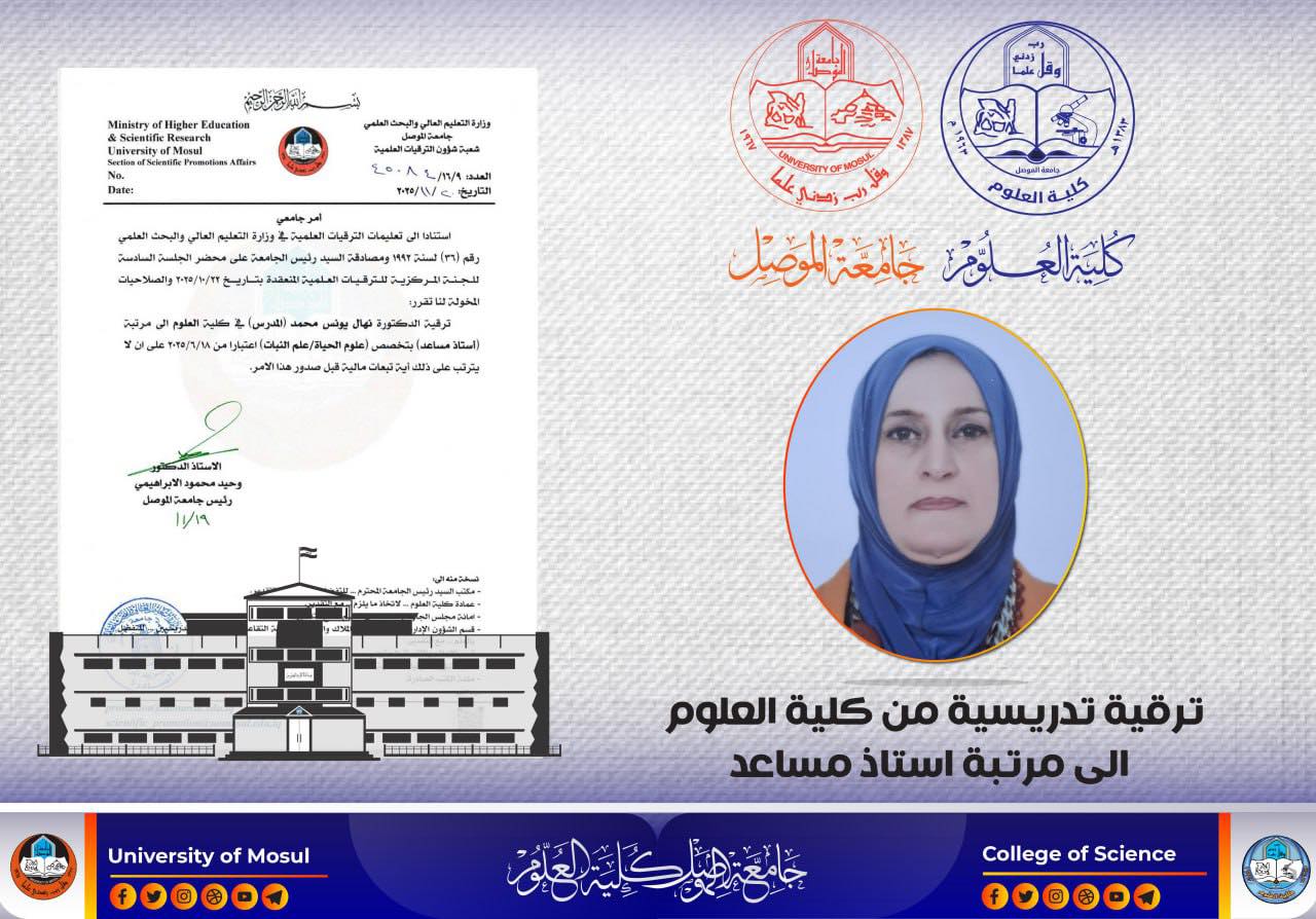 تقديـراً للمرتبـةِ العِلمِيَّـةِ الرَّفيعـةِ الَّتـي بلغتهـا، مَنَـحَ السيـدُ رئيـسُ جامعة الموصل الأُستاذ الدكتـور وحيد محمود الإبراهيمي المُحتـرم مشكـوراً كتـاب شكرٍ وتقديـرٍ مع ما يترتَّـبُ عليـه من [إقرأ المزيد]