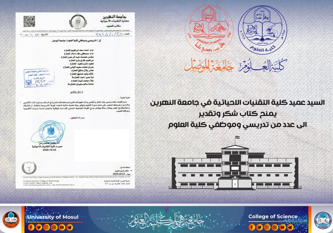 تقديـراً للمرتبـةِ العِلمِيَّـةِ الرَّفيعـةِ الَّتـي بلغهـا، مَنَـحَ السيـدُ رئيـسُ جامعة الموصل الأُستاذ الدكتـور وحيد محمود الإبراهيمي المُحتـرم مشكـوراً كتـاب شكرٍ وتقديـرٍ مع ما يترتَّـبُ عليـه [إقرأ المزيد]